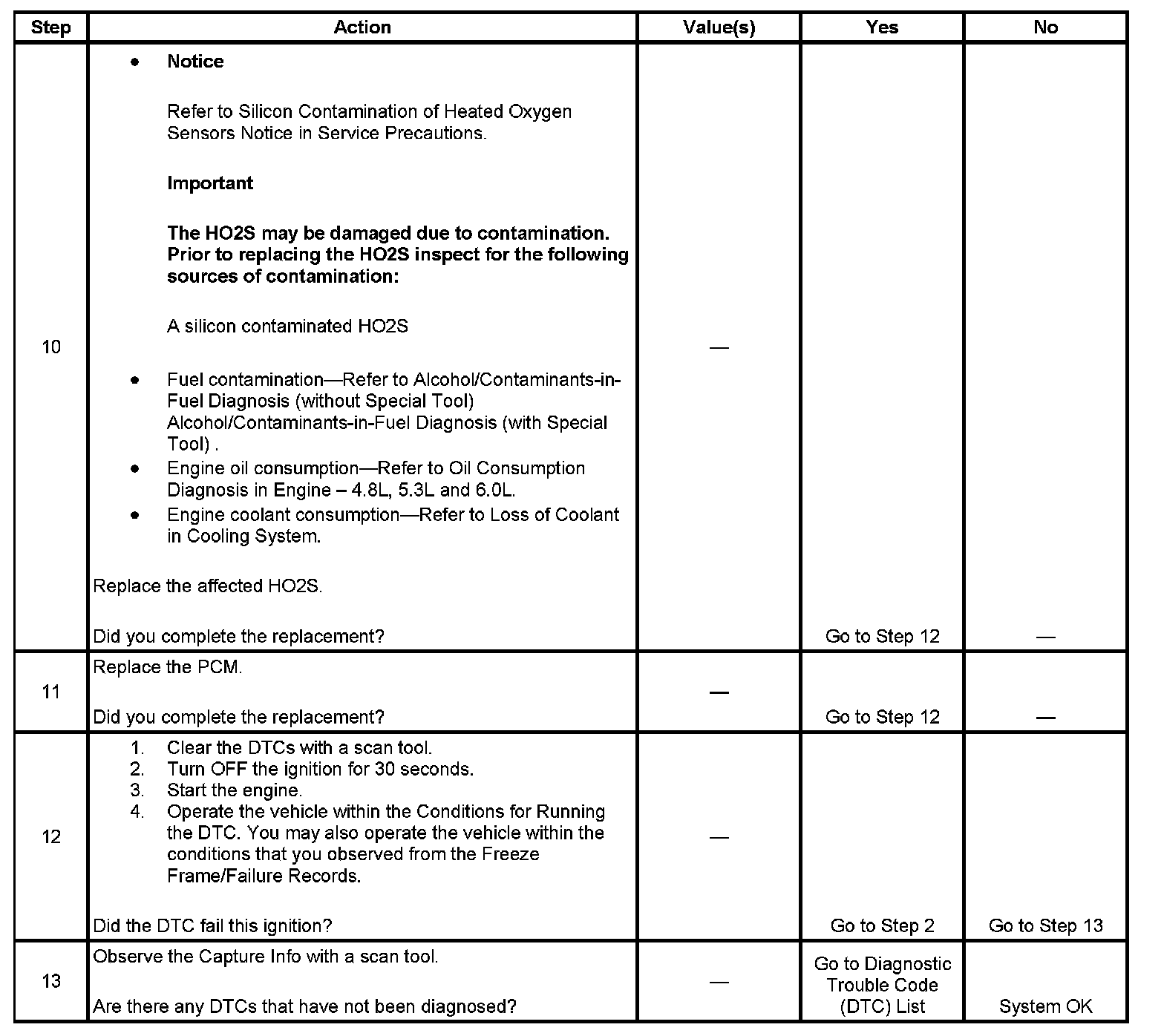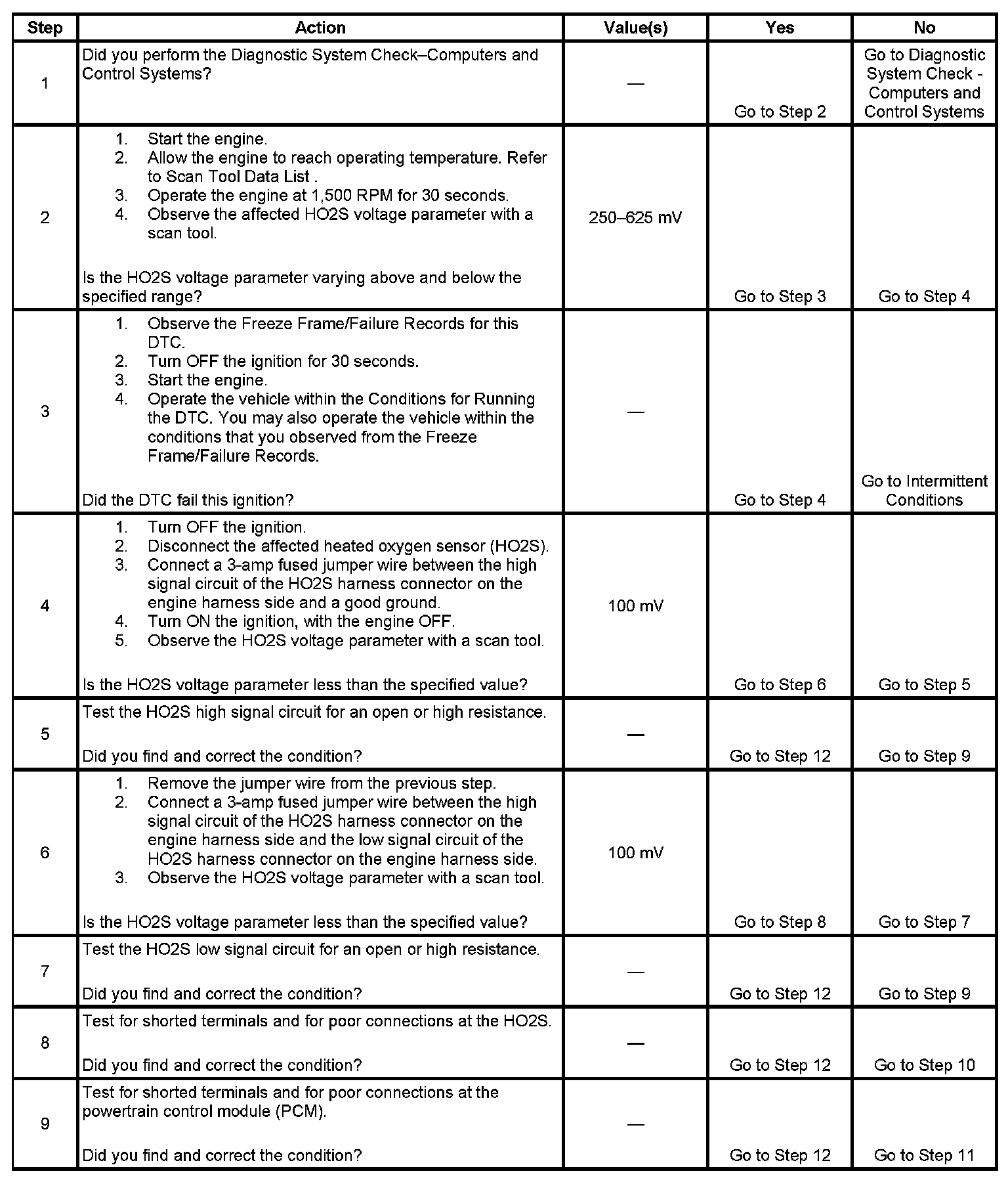 Heated oxygen sensors (HO2S) are used for fuel control and post catalyst monitoring. Each HO2S compares the oxygen content of the surrounding air with the oxygen content in the exhaust stream. The HO2S must reach operating temperature to provide an accurate voltage signal. Heating elements inside the HO2S minimize the time required for the sensors to reach operating temperature. The powertrain control module (PCM) supplies the HO2S with a reference, or bias, voltage of about 450 mV. When the engine is first started the PCM operates in open loop, ignoring the HO2S voltage signal. Once the HO2S reaches operating temperature and closed loop is achieved, the HO2S generates a voltage within a range of 0-1,000 mV that fluctuates above and below bias voltage. High HO2S voltage indicates a rich exhaust stream, low HO2S voltage indicates a lean exhaust stream. This diagnostic will only run once per ignition cycle. The PCM monitors the rich-to-lean and lean-to-rich transition time. A transition is defined as, the HO2S voltage changes from above 625 mV to below 250 mV or from below 250 mV to above 625 mV. If the PCM detects that the transition time is too long, DTC P0133 sets for HO2S bank 1 sensor 1, or DTC P0153 sets for HO2S bank 2 sensor 1.