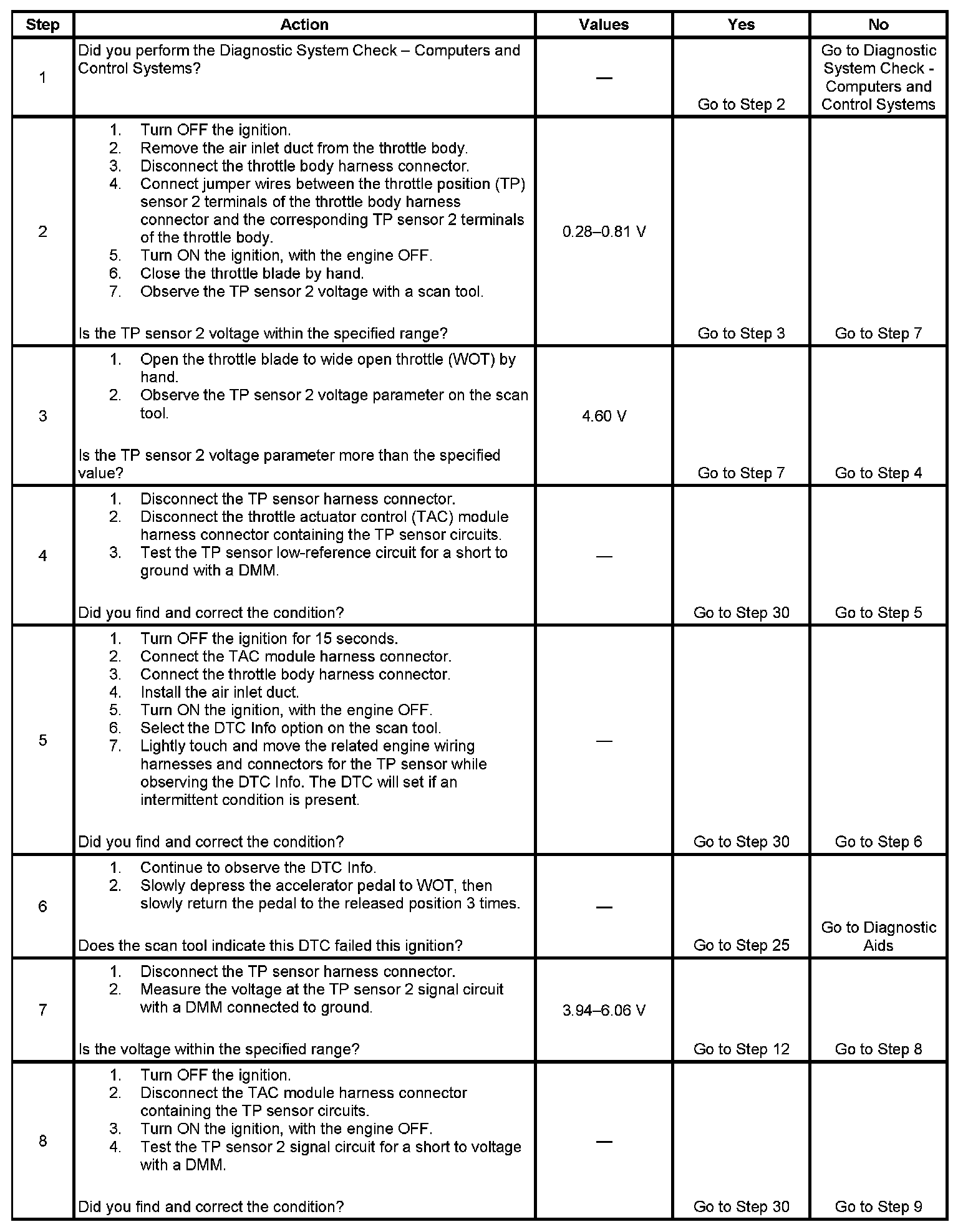 The TP sensor is used to determine the throttle plate angle for various engine management systems. The control module provides the TP sensor a 5-volt reference circuit and a low reference circuit. The TP sensor then provides the control module a signal voltage proportional to throttle plate movement. The TP sensor 1 signal voltage is low at closed throttle and increases as the throttle opens. When the control module detects that the TP sensor 2 signal or the TP sensor 5-volt reference voltage is outside the predetermined range, this DTC sets.
