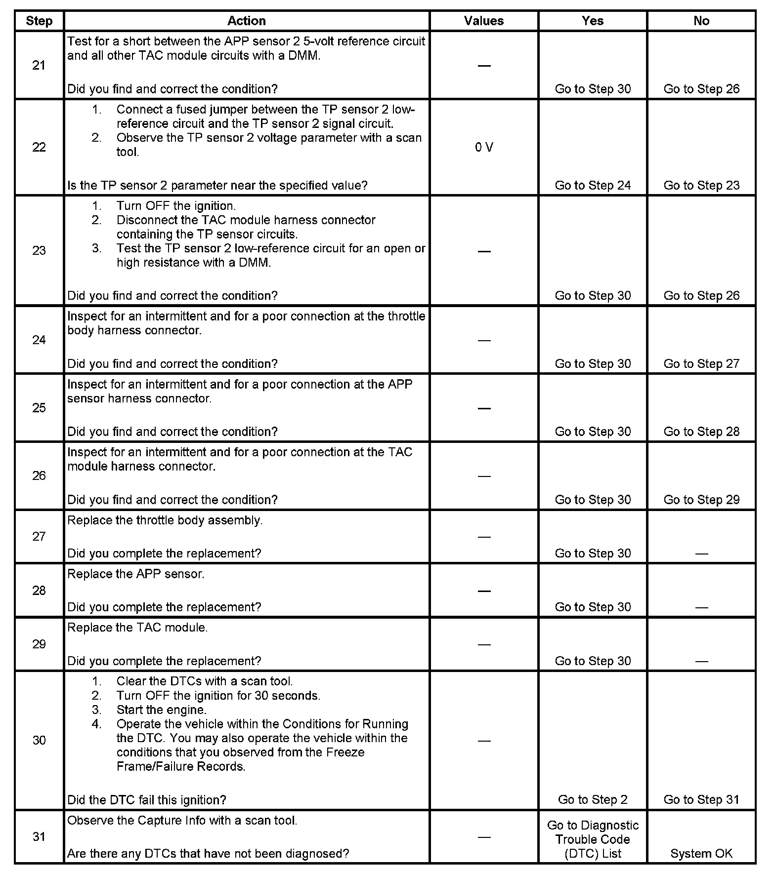 31. When the TAC module detects a condition within the TAC system, more than one TAC system related DTC may set. This is due to the many redundant tests run continuously on this system. Locating and repairing one individual condition may correct more than one DTC. Disconnecting components during testing may set additional DTCs. Keep this in mind when reviewing the stored information, Capture Info.