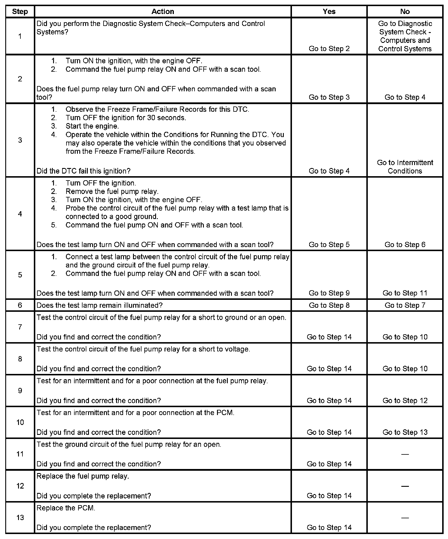 The control module monitors the voltage on the fuel pump relay control circuit. If the control module detects an incorrect voltage on the fuel pump relay control circuit, a fuel pump relay control DTC sets.