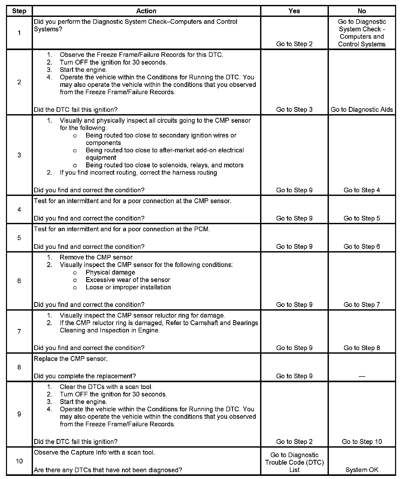 The CMP sensor 1 X signal is used by the PCM to determine if the cylinder at top dead center (TDC) is on the firing stroke or the exhaust stroke. The PCM can determine TDC for all cylinders by using the CKP sensor 24 X signal alone. The engine will start without a CMP signal as long as the PCM receives the CKP sensor 24 X signal. A slightly longer cranking time may be a symptom of this condition. The system attempts synchronization and looks for an increase in engine speed indicating that the engine started. If the PCM does not detect an increase in engine speed, the PCM assumes that the PCM incorrectly synchronized to the exhaust stroke and re-syncs to the opposite cam position. If the PCM detects that a CMP to CKP mis-match has occurred DTC P0341 sets.