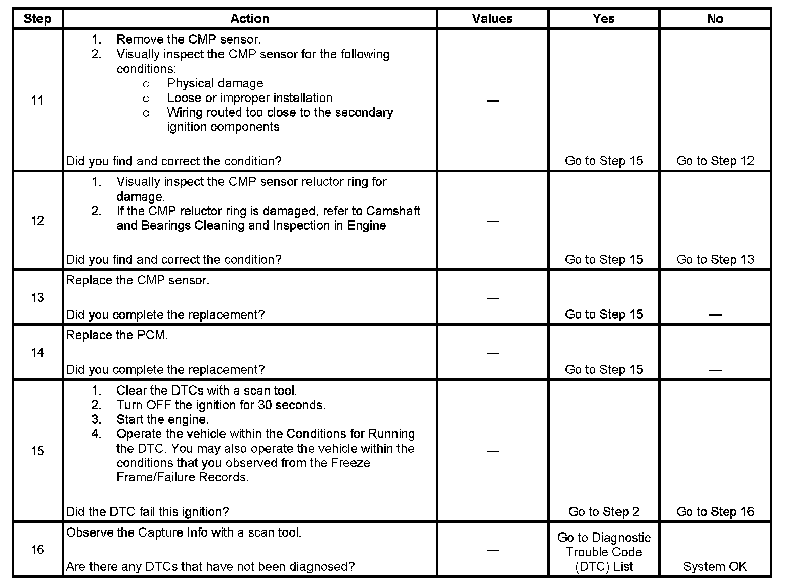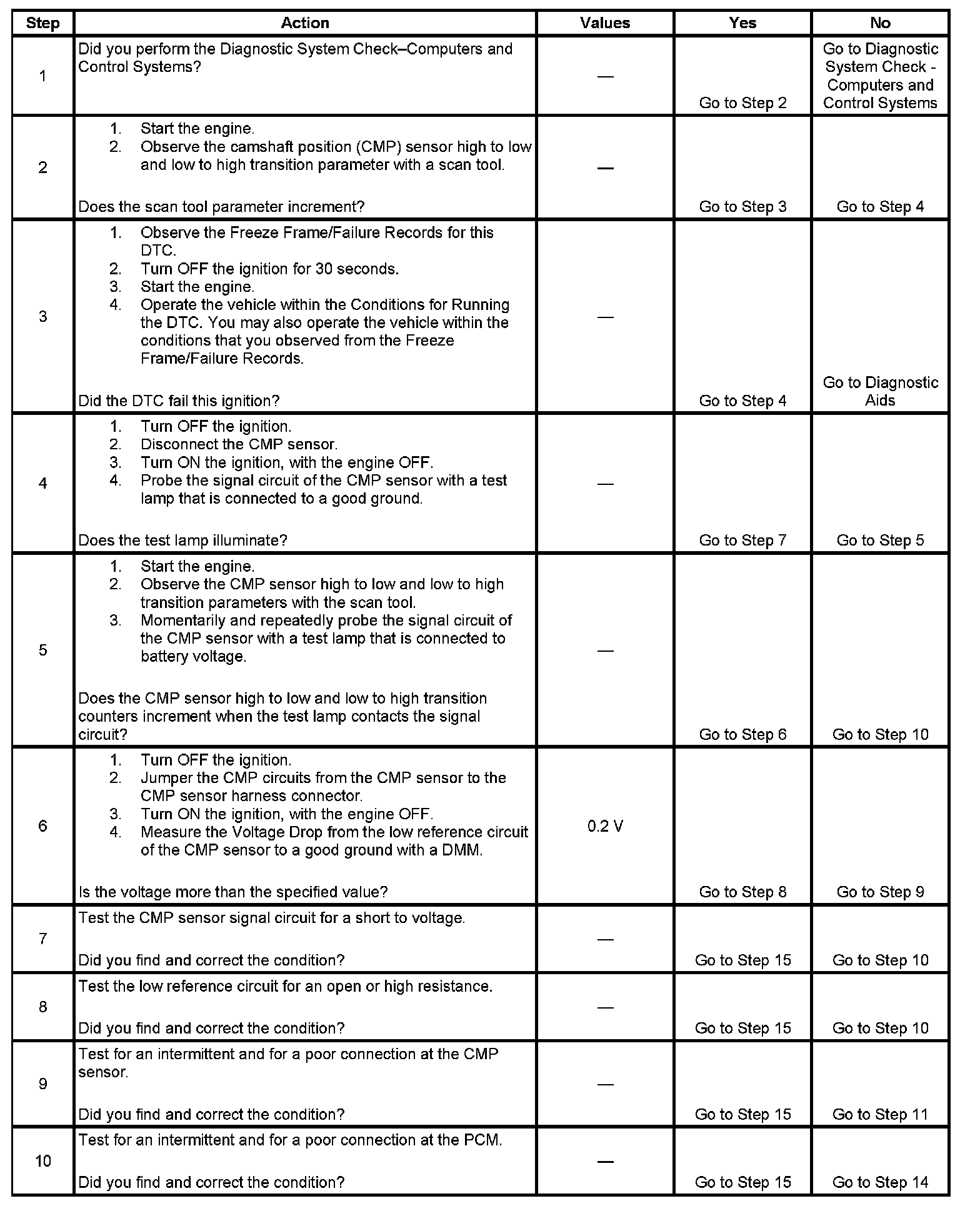 The CMP sensor 1 X signal is used by the PCM to determine if the cylinder at top dead center (TDC) is on the firing stroke or the exhaust stroke. The PCM can determine TDC for all cylinders by using the CKP sensor 24 X signal alone. The engine will start without a CMP signal as long as the PCM receives the CKP sensor 24 X signal. A slightly longer cranking time may be a symptom of this condition. The system attempts synchronization and looks for an increase in engine speed indicating that the engine started. If the PCM does not detect an increase in engine speed, the PCM assumes that the PCM incorrectly synchronized to the exhaust stroke and re-syncs to the opposite cam position. If the PCM detects that the CMP signal is constantly high, DTC P0343 sets.