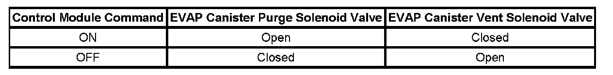 The table illustrates the relationship between the ON and OFF states, and the OPEN or CLOSED states of the EVAP canister purge and vent solenoid valves.