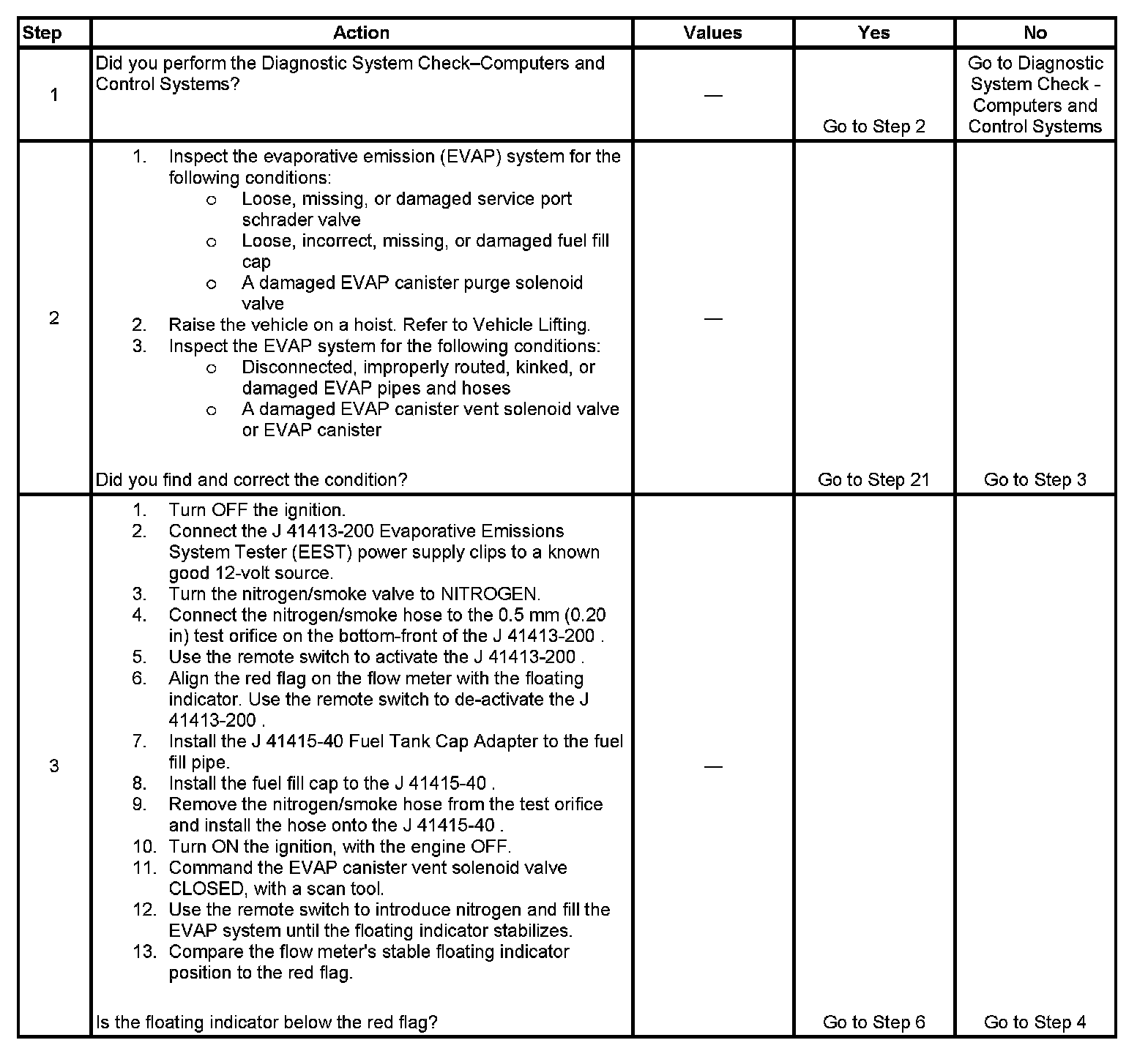 The numbers below refer to the step numbers on the diagnostic table.