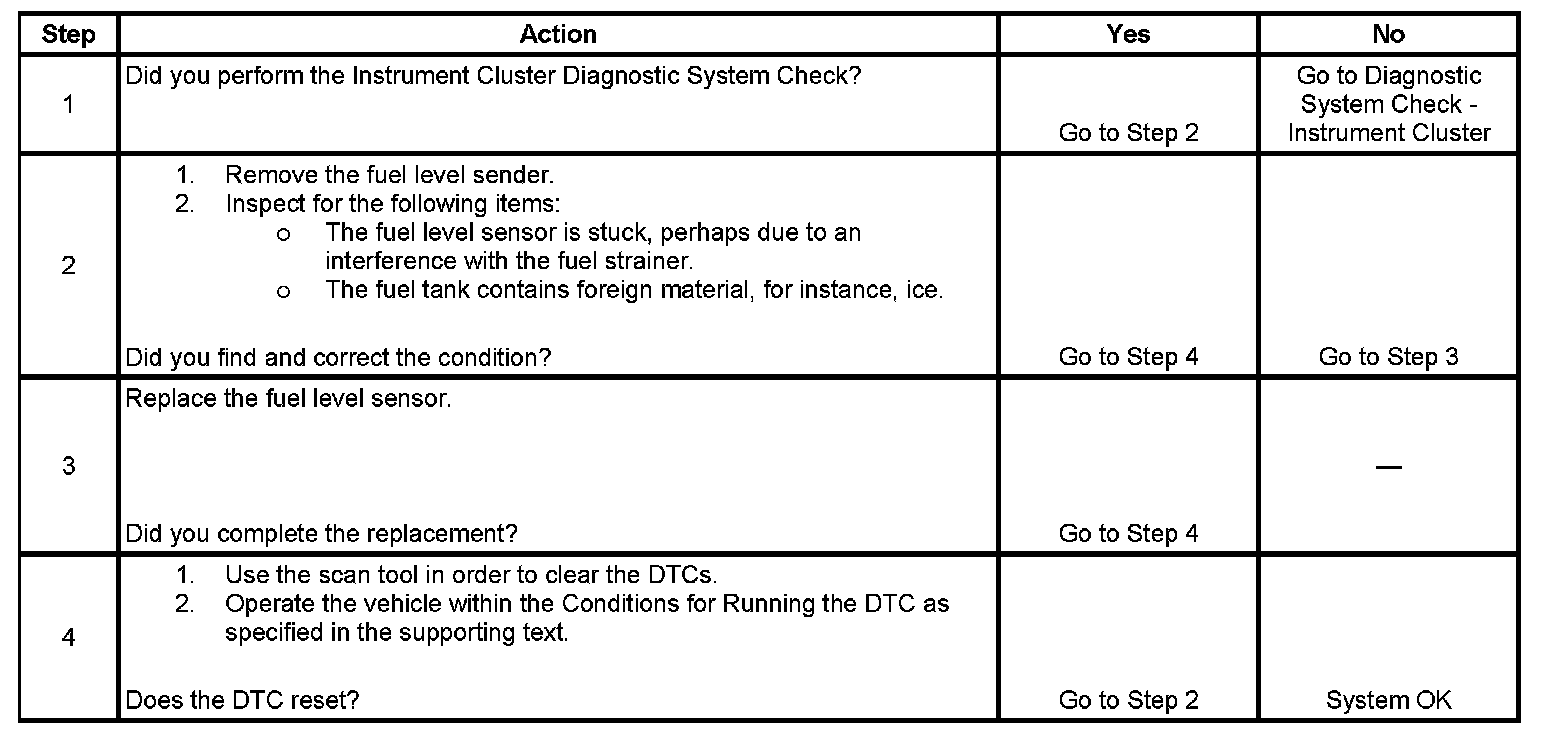The fuel level sensor changes resistance in response to the fuel level. The PCM monitors the signal circuit of the fuel level sensor in order to determine the fuel level. When the fuel tank is full, the sensor resistance is high and the PCM senses a high signal voltage. When the fuel tank is empty, the sensor resistance is low and the PCM senses a low signal voltage. The PCM uses the signal circuit of the fuel level sensor in order to calculate the percentage of remaining fuel in the tank. The PCM sends the fuel level percentage via the class 2 serial data circuit to the instrument cluster in order to control the fuel gage. The fuel level information is also used for misfire and EVAP diagnostics.