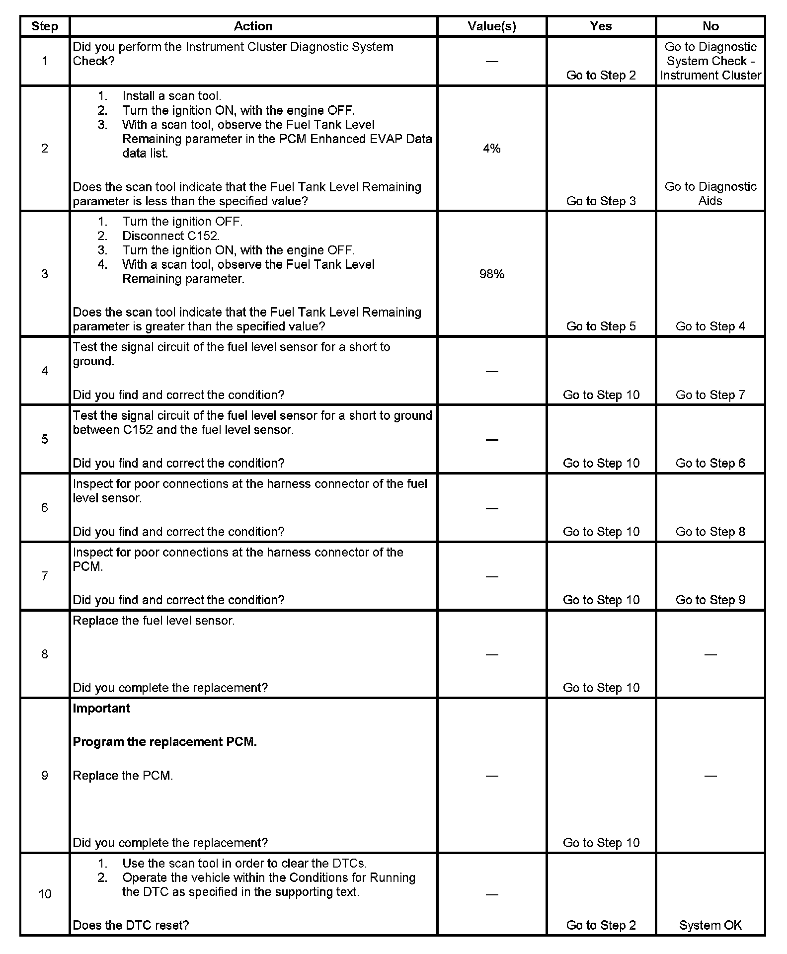 The number below refers to the step number on the diagnostic table.