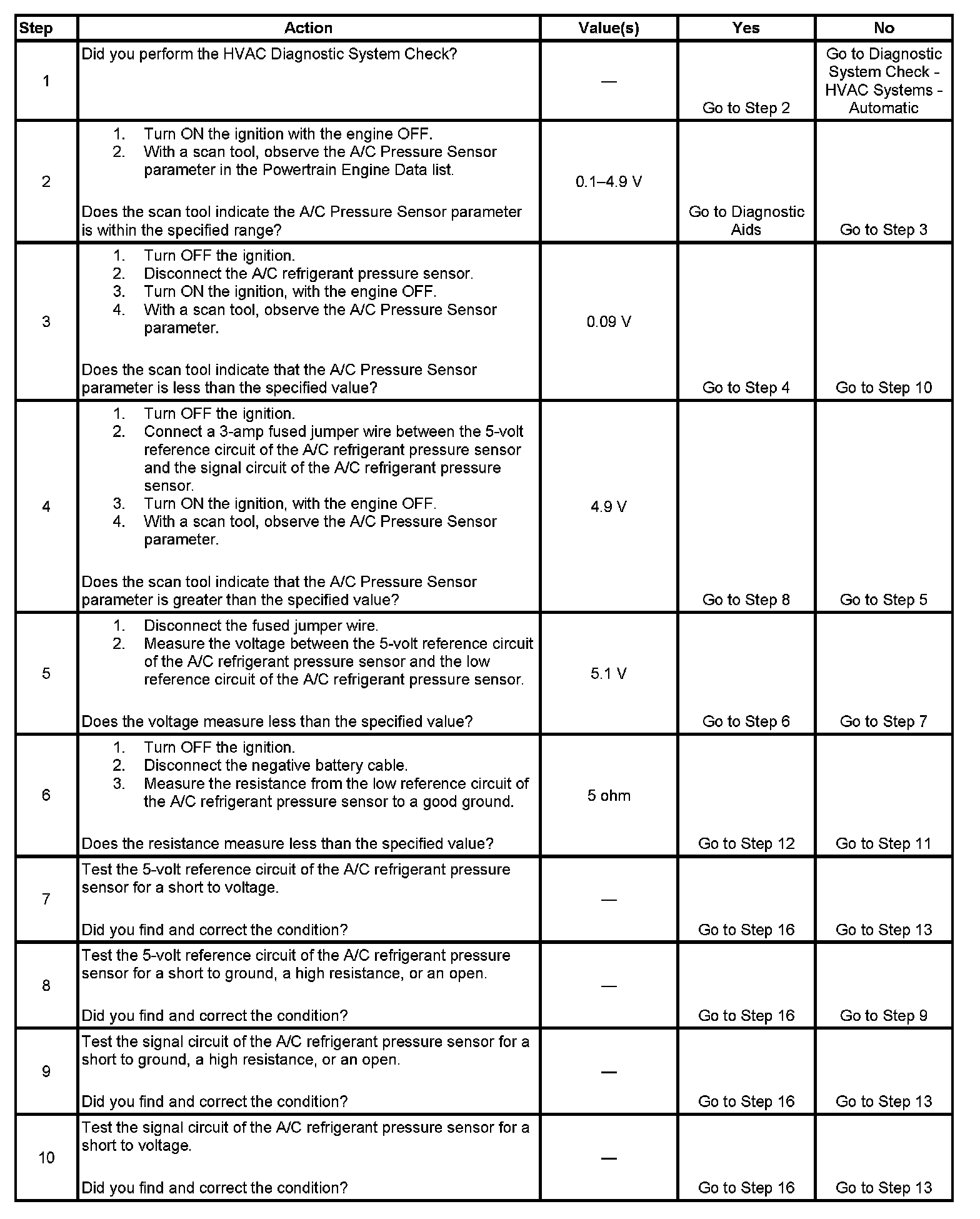 - The A/C refrigerant pressure sensor signal is less than 0.1 volts for 5 seconds.