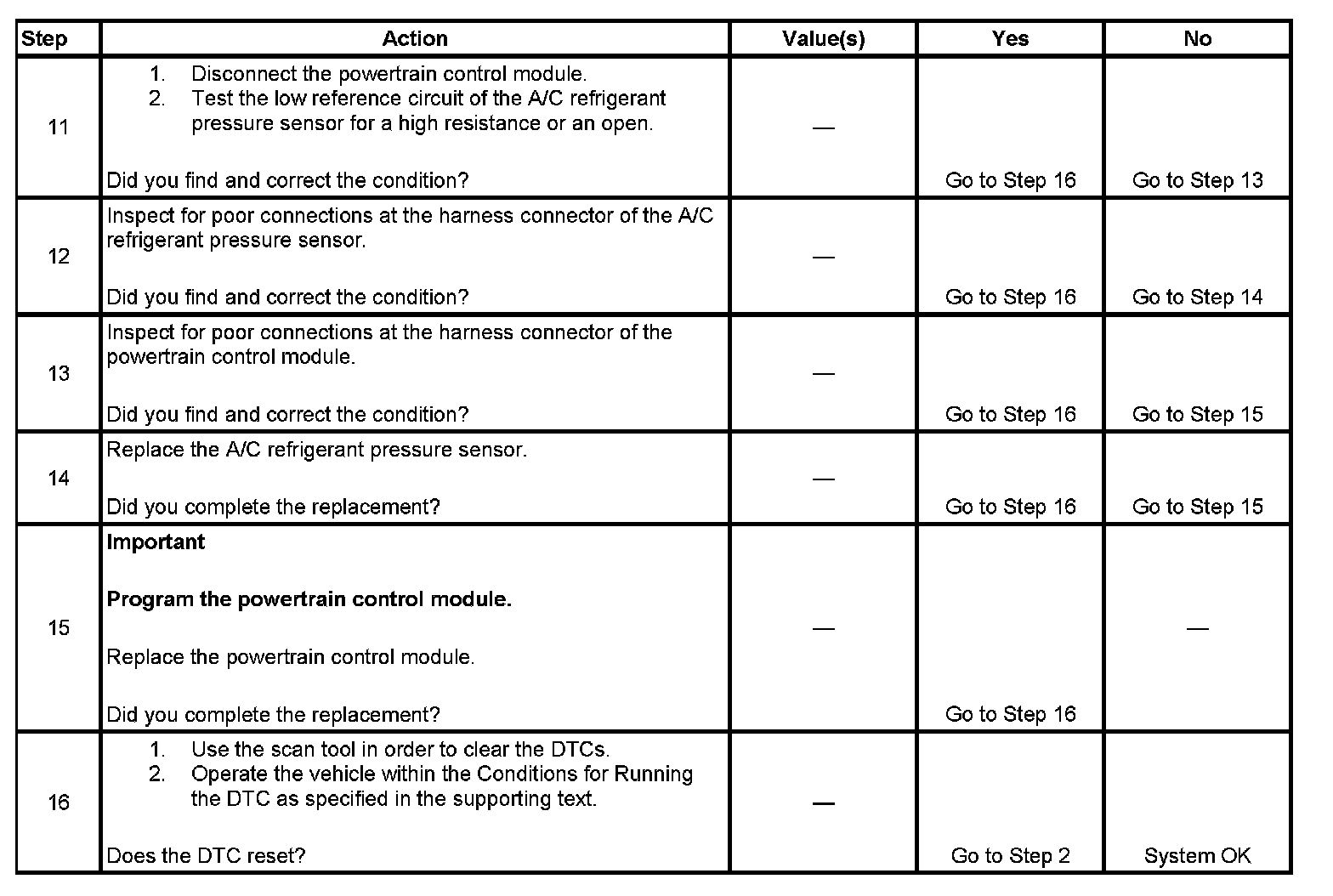 The numbers below refer to the step numbers on the diagnostic table.