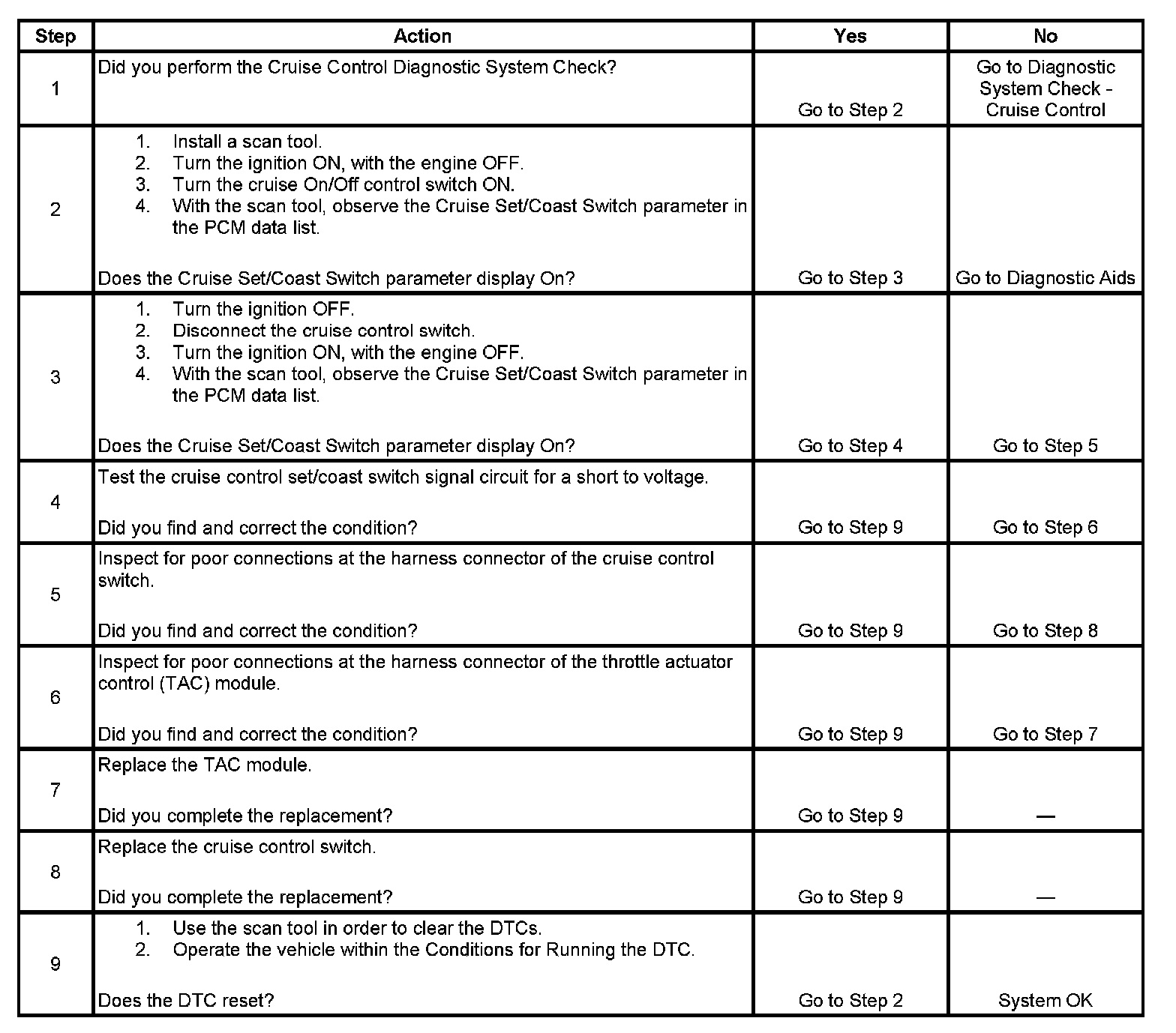 The cruise control set/coast switch is an input to the throttle actuator control (TAC) module. The TAC module uses the cruise control set/coast switch signal circuit in order to detect when the driver has requested to set the vehicle speed or to decelerate the vehicle speed. The TAC module detects a voltage signal on the cruise control set/coast switch signal circuit when the switch is applied. The TAC module sends a serial data signal to the powertrain control module (PCM) via the UART serial data circuit. This DTC sets if the PCM receives a serial data signal from the TAC module indicating that voltage is present on the cruise control set/coast switch signal circuit for longer than 90 seconds.
