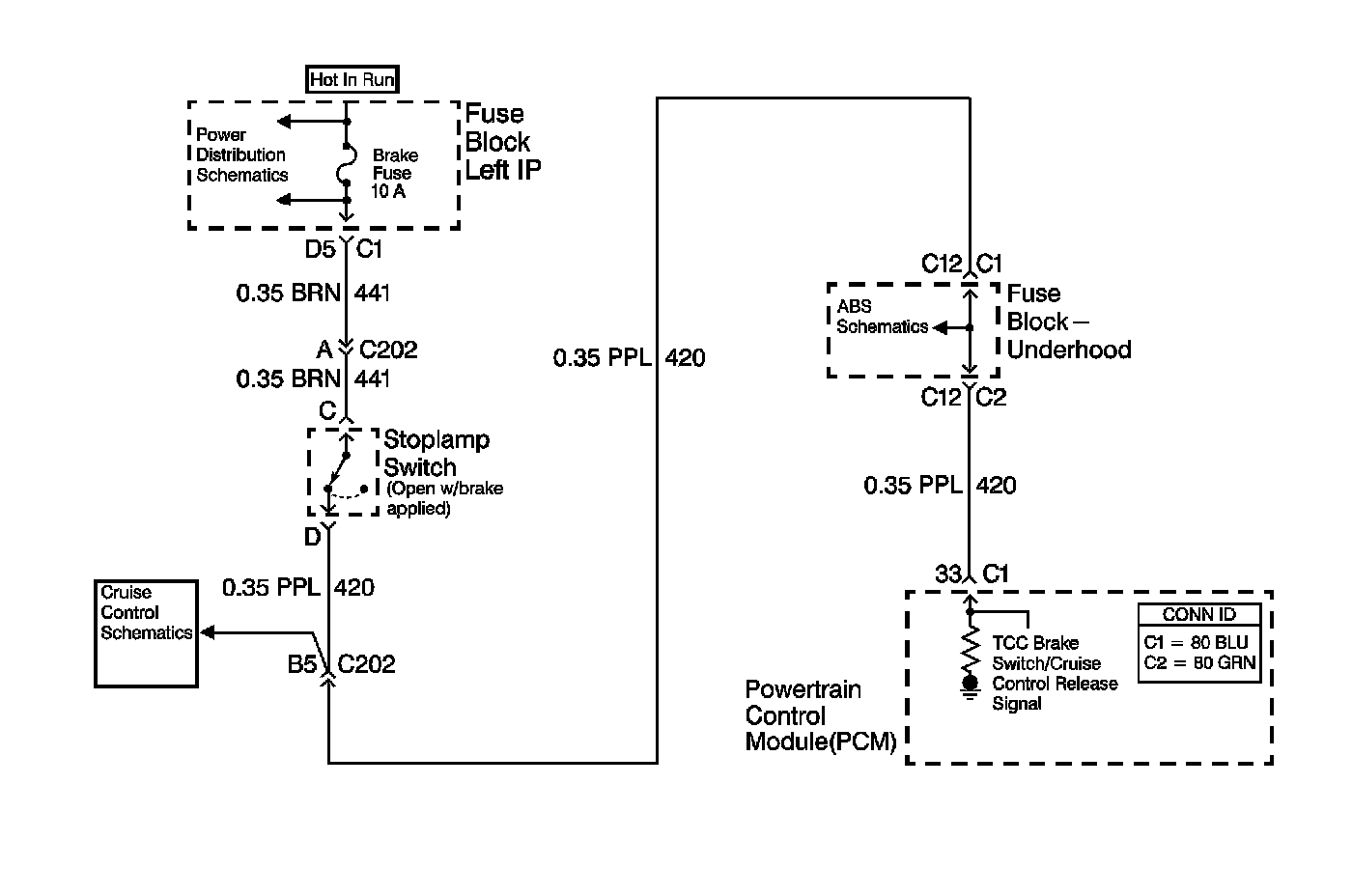 The brake switch indicates brake pedal status to the powertrain control module (PCM). The brake switch is a normally-closed switch that supplies battery voltage on the TCC brake switch signal circuit to the PCM. Applying the brake pedal opens the switch, interrupting voltage to the PCM. When the brake pedal is released, the PCM receives a constant voltage signal. If the PCM receives a zero voltage signal at the brake switch input, and the torque converter clutch (TCC) is engaged, the PCM de-energizes the TCC solenoid valve. The PCM disregards the brake switch input for TCC scheduling if there is a brake switch circuit fault.