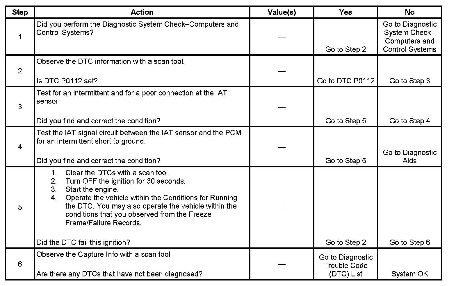 The intake air temperature (IAT) sensor is a variable resistor. The IAT sensor has a signal circuit and a low reference circuit. The IAT sensor measures the temperature of the air entering the engine. The powertrain control module (PCM) supplies 5 volts to the IAT signal circuit and a ground for the IAT low reference circuit. When the IAT sensor is cold, the sensor resistance is high. When the air temperature increases, the sensor resistance decreases. With high sensor resistance, the PCM detects a high voltage on the IAT signal circuit. With lower sensor resistance, the PCM detects a lower voltage on the IAT signal circuit. If the PCM detects an intermittent low IAT signal voltage, indicating a high temperature, DTC P1112 sets.