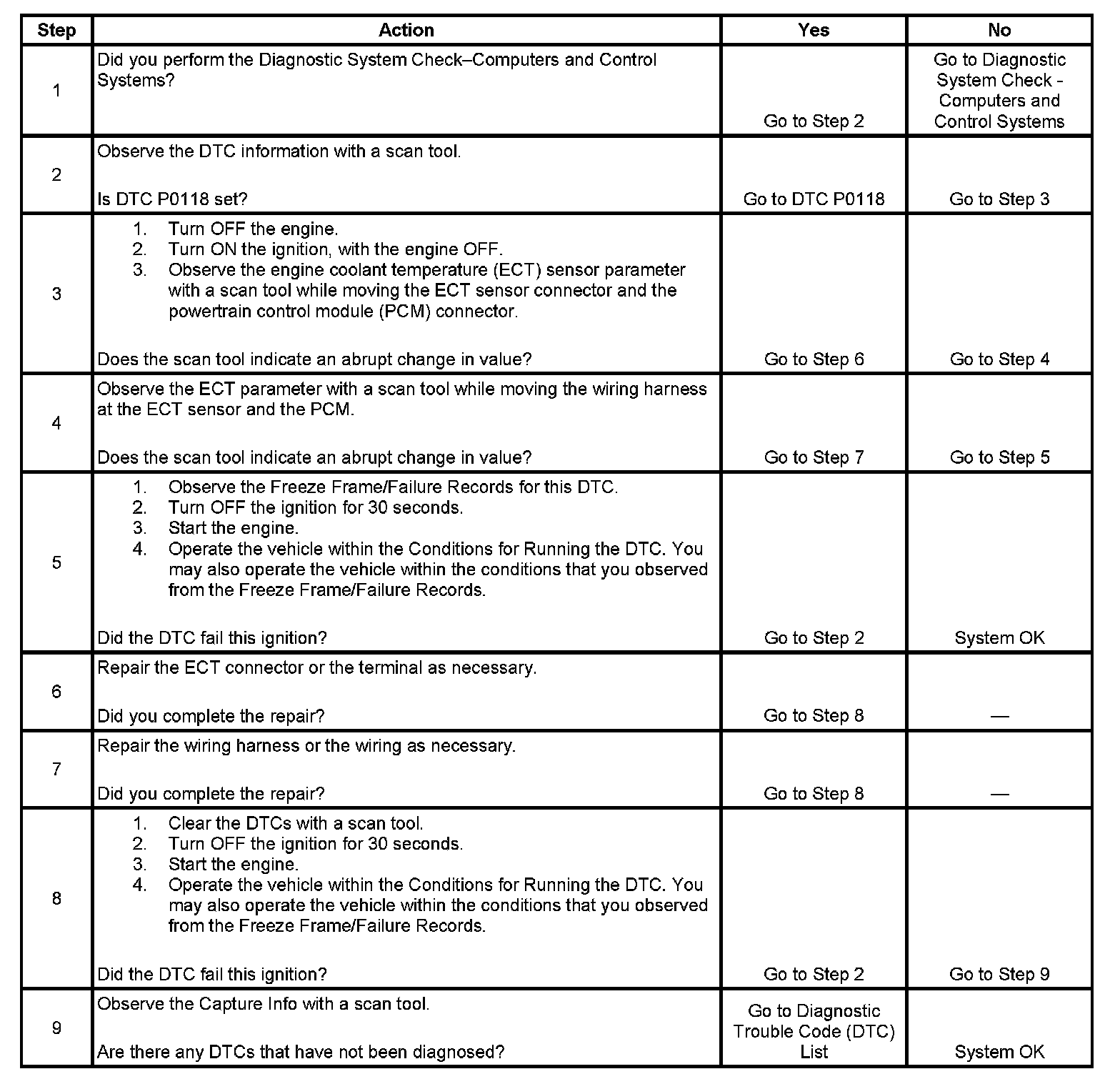 The engine coolant temperature (ECT) sensor is a variable resistor, that measures the temperature of the engine coolant. The powertrain control module (PCM) supplies 5 volts to the ECT signal circuit and a ground for the ECT low reference circuit. When the ECT is cold, the sensor resistance is high. When the ECT increases, the sensor resistance lowers. With high sensor resistance, the PCM detects a high voltage on the ECT signal circuit. With lower sensor resistance, the PCM detects a lower voltage on the ECT signal circuit. If the PCM detects an excessively high signal voltage, which is a low temperature indication, DTC P1115 sets.
