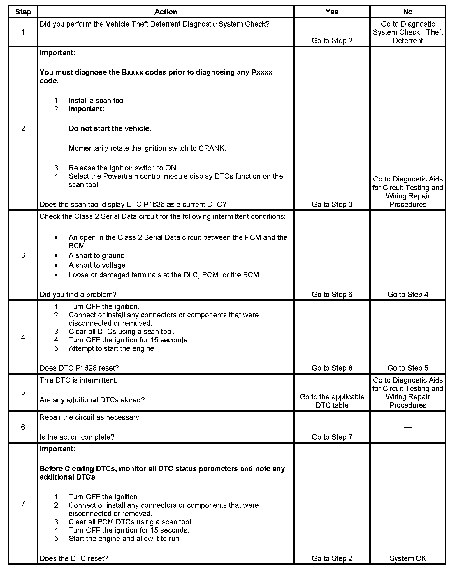 - If the Class 2 Serial Data circuit is shorted to ground or shorted to voltage, then all systems connected to the serial data circuit will not be able to communicate properly. Systems capable of storing loss of communications DTCs, or the DTCs with the letter "U" as a prefix, will have these codes stored in their memory. If a DTC U1192 is stored in the PCM memory along with the P1626, then a fault occurred at some point after the PCM received the correct password. The BCM must also be checked for intermittent operation due to a loss of power or ground to the module itself. After repairing the cause of DTC 1626, clear all DTCs from the systems capable of storing this DTC and DTC U1192.