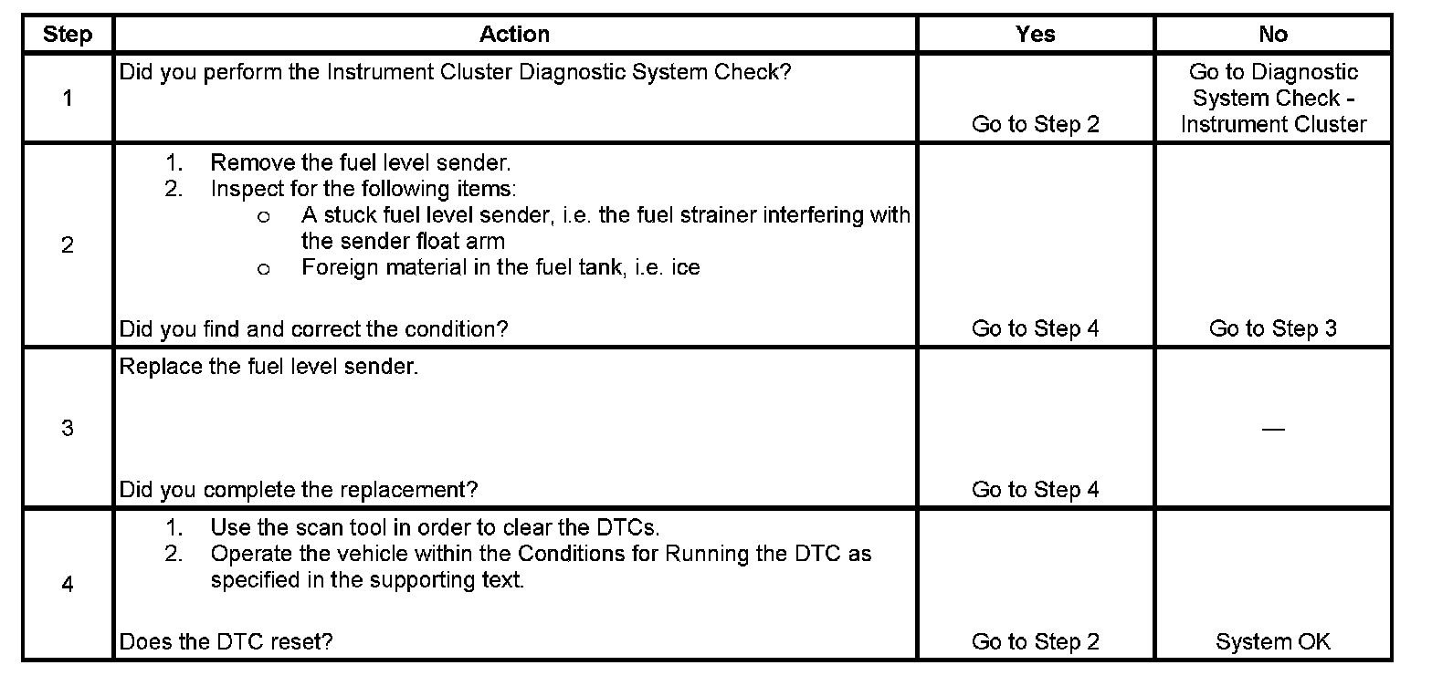 The primary fuel level sender and the secondary fuel level sender changes resistance based on fuel level. The PCM monitors the signal circuits of the primary fuel level sender and the secondary fuel level sender in order to determine the fuel level. When the fuel tank is full, the resistance of both fuel level senders are high and the PCM senses a high signal voltage on both the signal circuits of the primary fuel level sender and the secondary fuel level sender. When the fuel tanks are empty, the resistance of the fuel level senders are low and the PCM senses a low signal voltage. The PCM uses the signal circuits of the primary fuel level sender and the secondary fuel level sender in order to calculate the percentage of remaining fuel in the tank. The PCM sends the fuel level percentage via the class 2 serial data circuit to the instrument cluster in order to control the fuel gage. The fuel level information is also used for misfire and EVAP diagnostics.