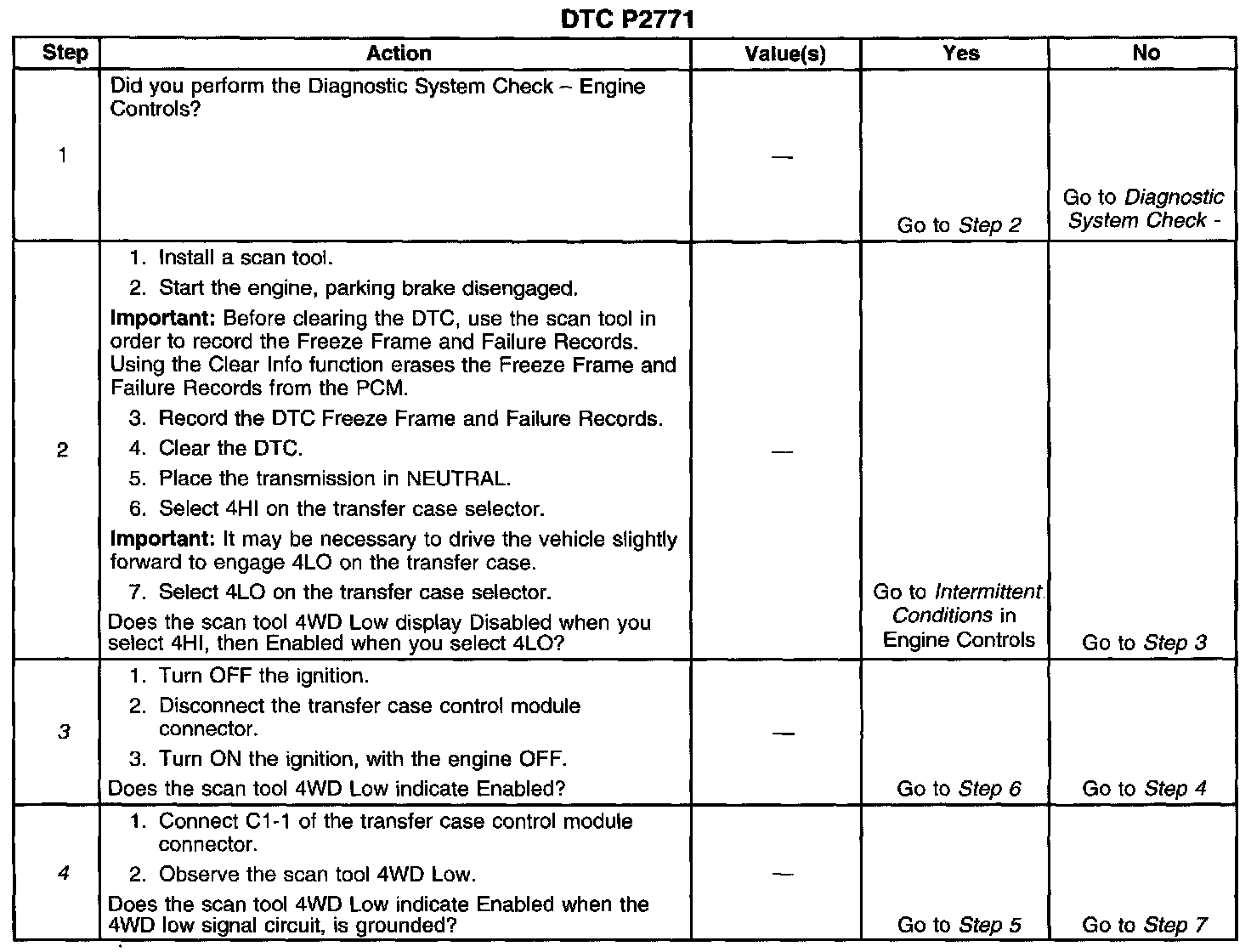 The four wheel drive (4WD) low circuit consists of the powertrain control module (PCM), a transfer case control module and the circuit wiring. The transfer case control module controls the 4WD low signal on the low signal circuit. When the operator selects 4WD low, the transfer case control module grounds the signal circuit, and the 4WD low signal voltage on the circuit changes from ignition voltage to zero volts. The PCM then compensates for transfer case gear reduction in the transmission output shaft speed (OSS) sensor signal. The PCM uses the transmission 055 sensor signal to adjust shift points, line pressure and torque converter clutch (TCC) scheduling. When the PCM detects a continuous open, short to ground or short to power in the 4WD low circuit, then DTC P2771 sets. DTC P2771 is a type B DTC.