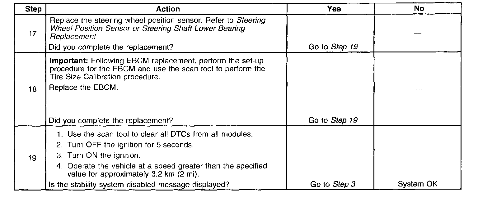 If the customer's concern is that the stability system disabled message is displayed intermittently, communicate with the customer to determine what driving conditions are being experienced at the time the message is displayed. The EBCM may be unable to successfully initialize the system during operation on very winding roads. Initialization may also be unsuccessful if pressure is continuously applied to the brake pedal during the initialization period.