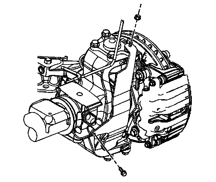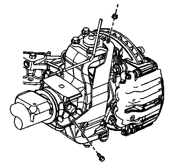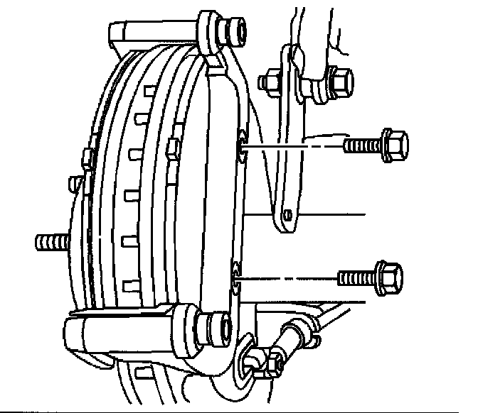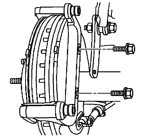 Notice: Support the brake caliper with heavy mechanic's wire, or equivalent, whenever it is separated from its mount and the hydraulic flexible brake hose is still connected. Failure to support the caliper in this manner will cause the flexible brake hose to bear the weight of the caliper, which may cause damage to the brake hose and in turn may cause a brake fluid leak.