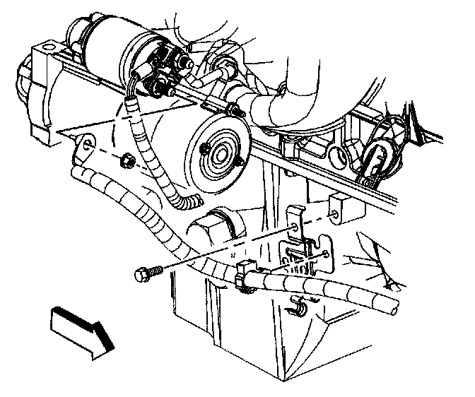 9. Install the positive battery cable clip and bolt to the oil pan.