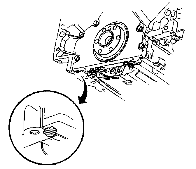 2. Apply a 5 mm (0.20 inch) bead of sealant GM P/N 12378190, or equivalent 20 mm (0.8 inch) long to the engine block. Apply the sealant directly onto the tabs of the rear cover gasket that protrudes into the oil pan surface.