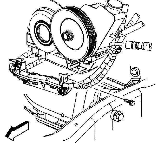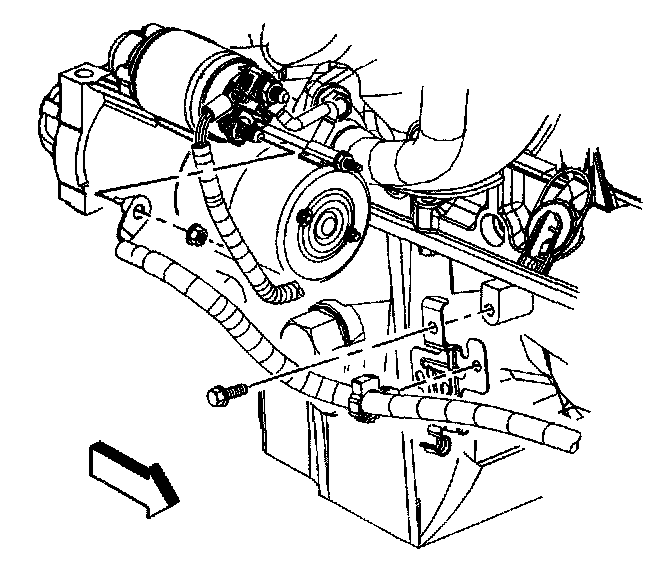 10. Install the engine oil cooler lines to the positive battery cable clip.