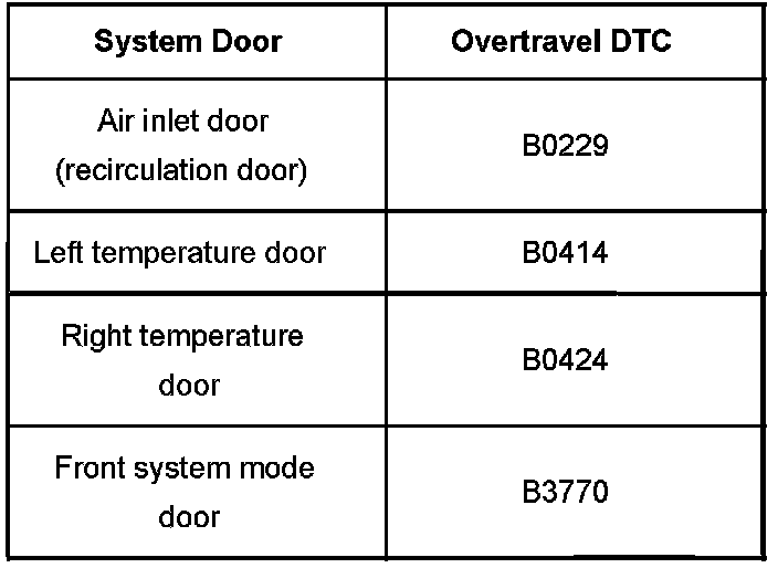 An overtravel of the HVAC system control doors may cause one or more of the concerns listed above. If an overtravel occurs, a Diagnostic Trouble Code (DTC) will be set, and the door will go to a preset default position. When a system door defaults, that door will stay at the default position until the DTC is cleared. After the DTC is cleared, the door will operate properly until the overtravel condition re-occurs.