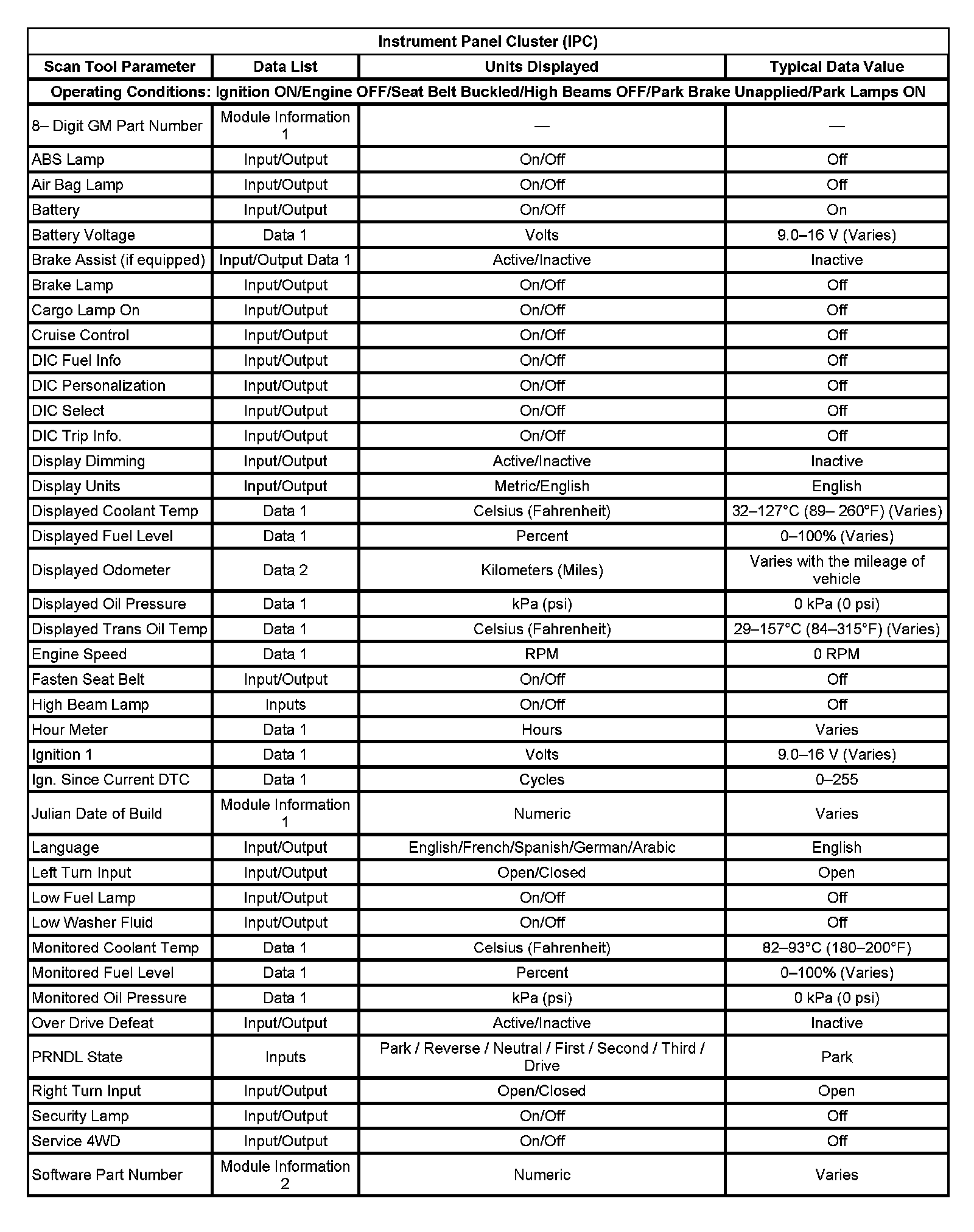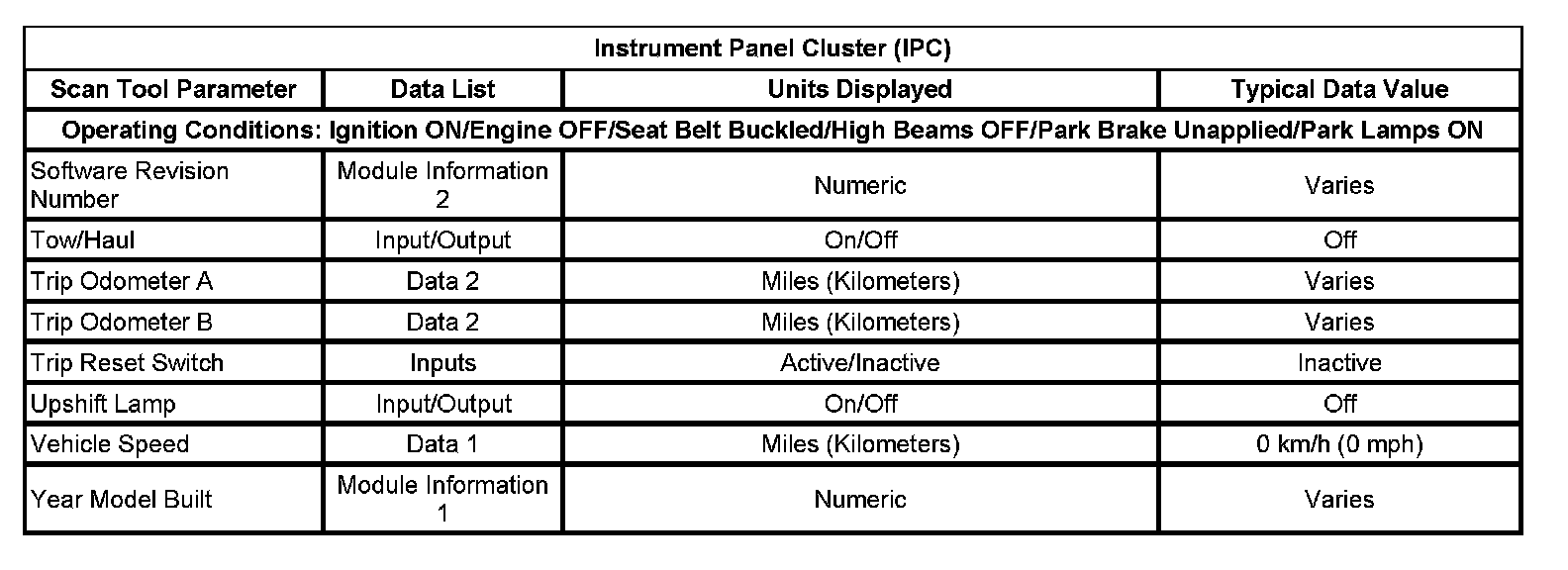 Scan Tool Data List - Instrument Panel Cluster (IPC)