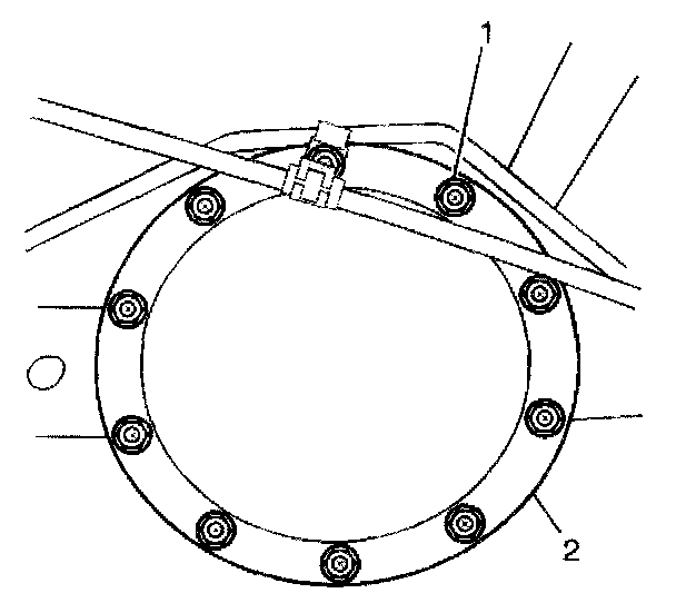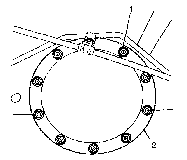3. Remove the rear axle housing cover bolts (1). Discard the rear axle housing cover bolts.