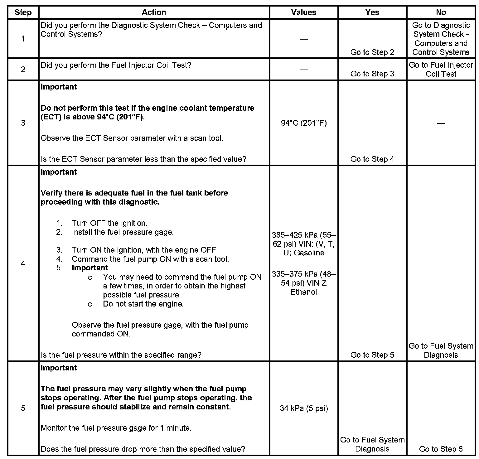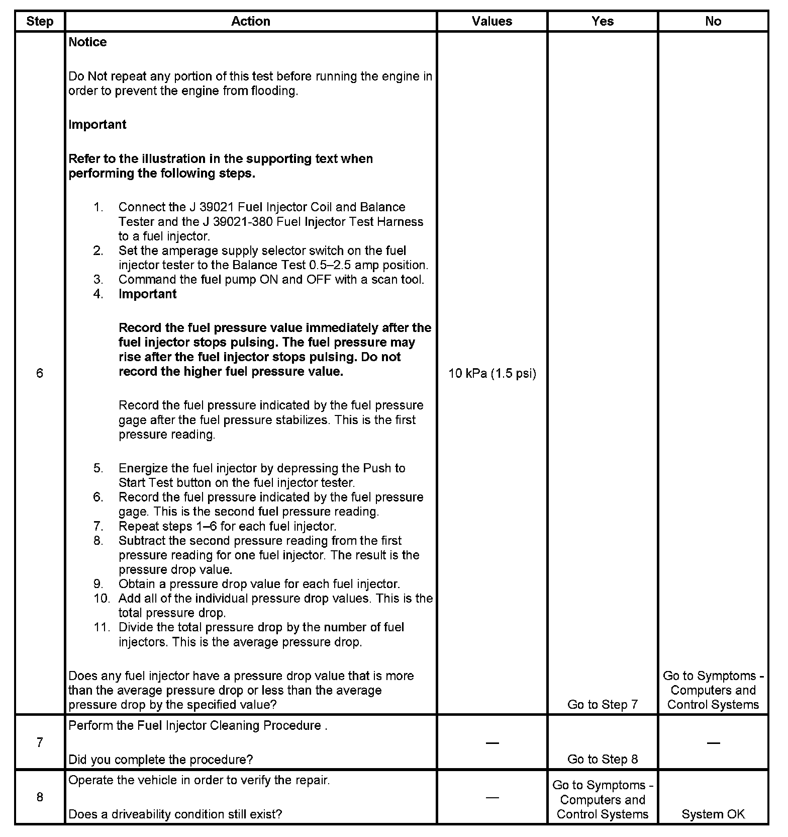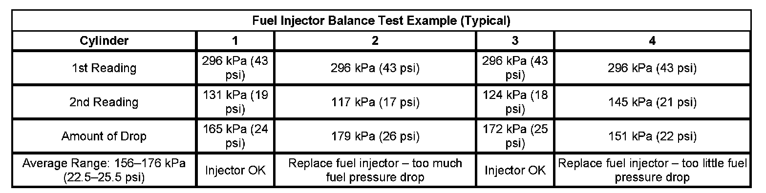 6. If the pressure drop value for each fuel injector is within 10 kPa (1.5 psi) of the average pressure drop value, the fuel injectors are flowing properly. Calculate the pressure drop value for each fuel injector by subtracting the second pressure reading from the first pressure reading. Refer to the illustration.