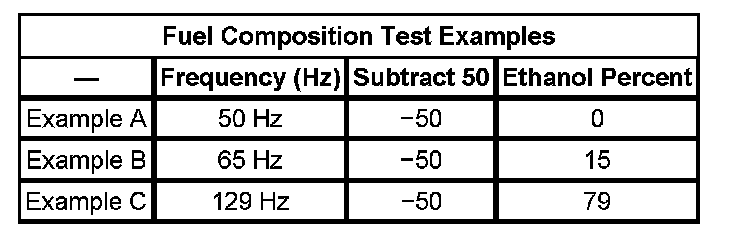 3. Subtract 50 from the reading on the DMM in order to obtain the percentage of alcohol in the fuel sample. Refer to the examples in the Fuel Composition Test Examples table.