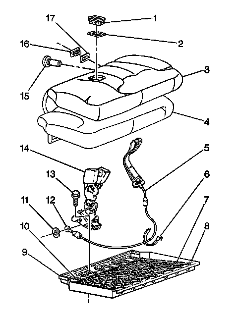 2. Install the bolt (13) that retains the buckle assembly (14) to the seat frame.