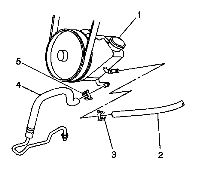 8. Remove the clamps (3,5) retaining the power steering return hoses to the power steering pump and remove the hoses.