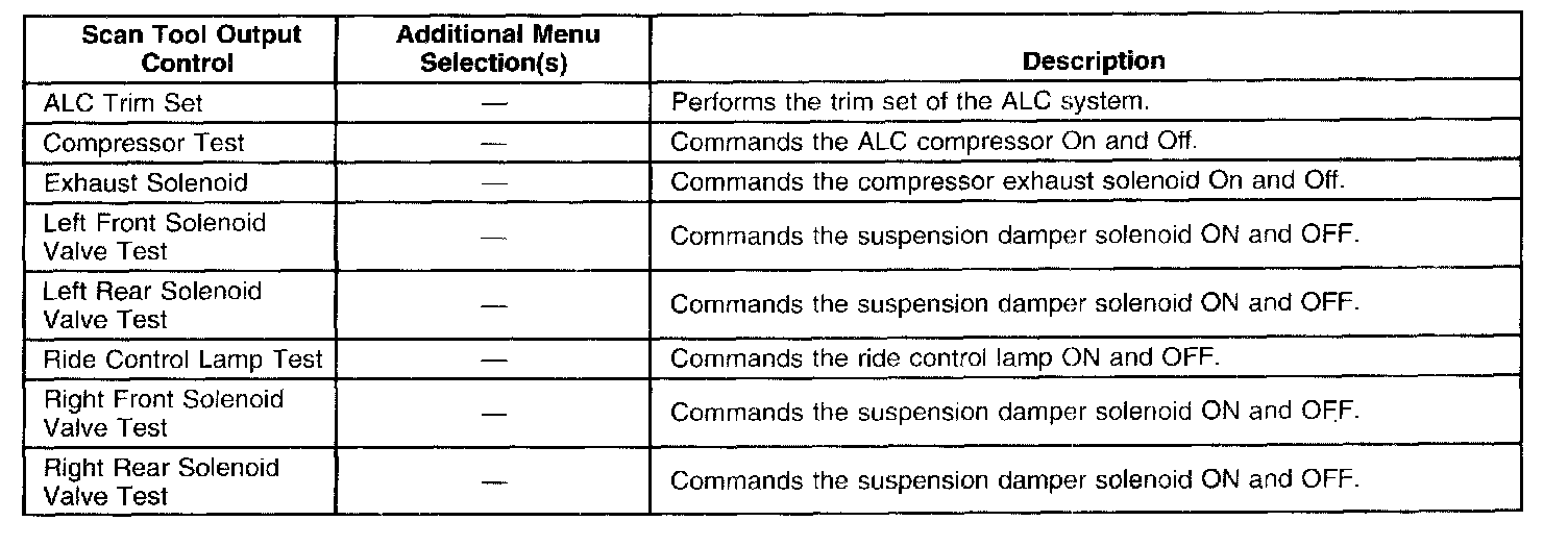 Scan Tool Output ControlsUse the scan tool Special Functions in order to perform certain tests and functions in the electronic suspension control (ESC) system and the automatic level control (ALC) system. The SERVICE RIDE CONTROL message can also be turned On and Off in the message center in the I/P. The table below lists the tests and functions that are available for the ESC system. The tests and functions are listed in alphabetical order.