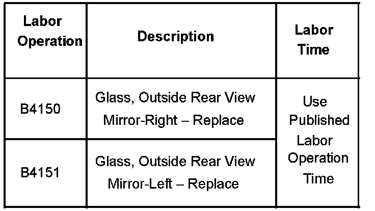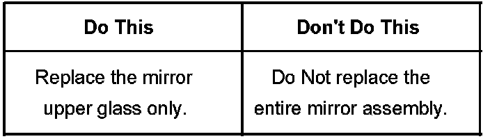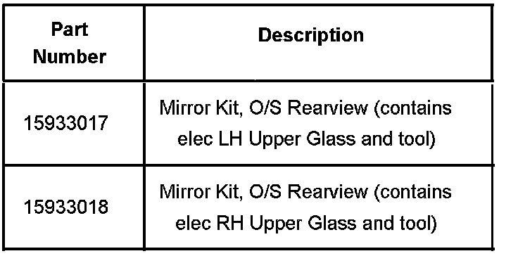 Replace the upper mirror glass only with a new mirror kit, P/N 15933017-LH or 15933018-RH. It is not necessary to replace the entire mirror assembly. The mirror kit contains the electric upper mirror glass and a molded wedge tool (instructions embossed on tool).