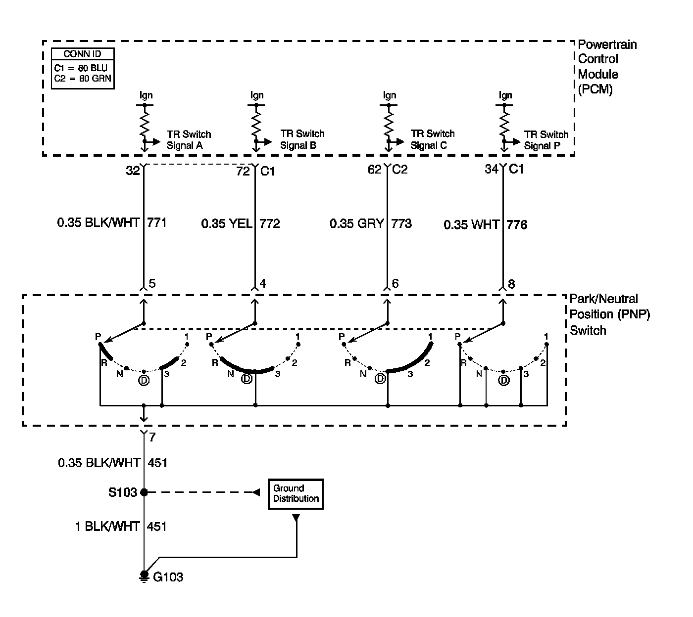 The transmission range (TR) switch is part of the park/neutral position (PNP) and back-up lamp switch assembly, which is externally mounted on the transmission manual shaft. The TR switch contains 4 internal switches that indicate the transmission gear range selector lever position. The powertrain control module (PCM) supplies ignition voltage to each switch circuit. As the gear range selector lever is moved, the state of each switch may change, causing the circuit to open or close. An open circuit or switch indicates a high voltage signal. A closed circuit or switch indicates a low voltage signal. The PCM detects the selected gear range by deciphering the combination of the voltage signals. The PCM compares the actual voltage combination of the switch signals to a TR switch combination chart stored in memory.
