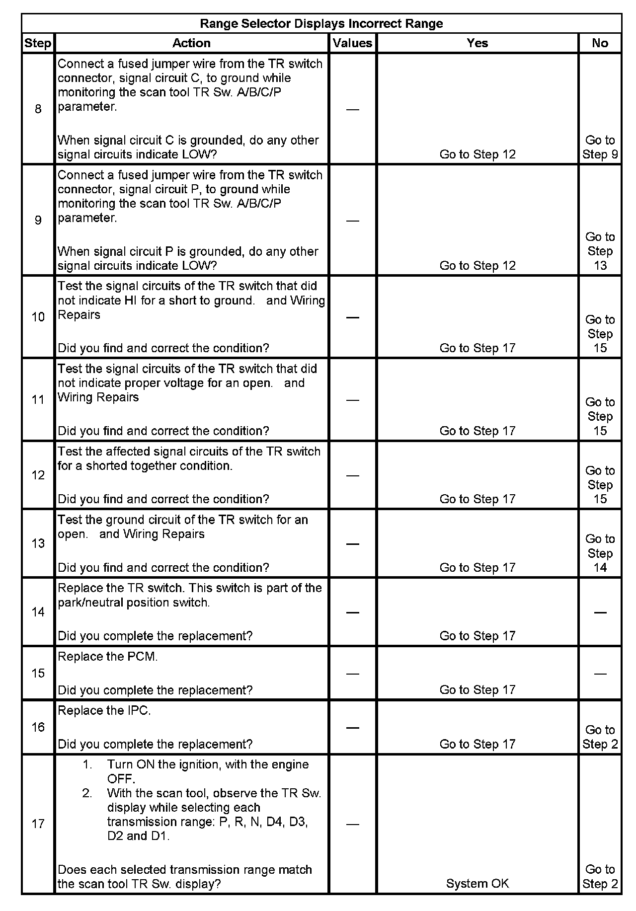 9. This step tests the TR switch wiring and the PCM by providing a ground path through a fused jumper wire. When grounded, the scan tool range signal states should change to LOW.