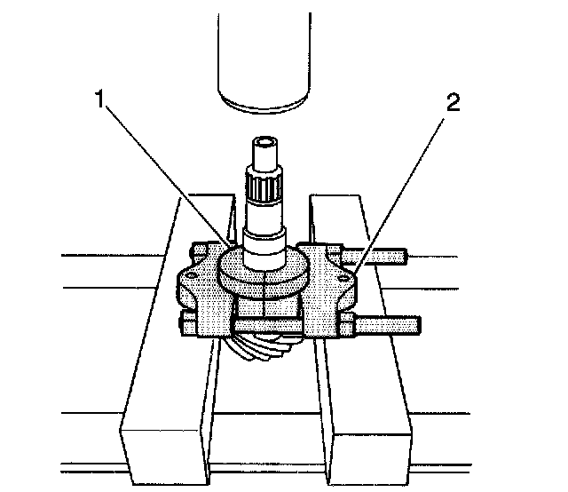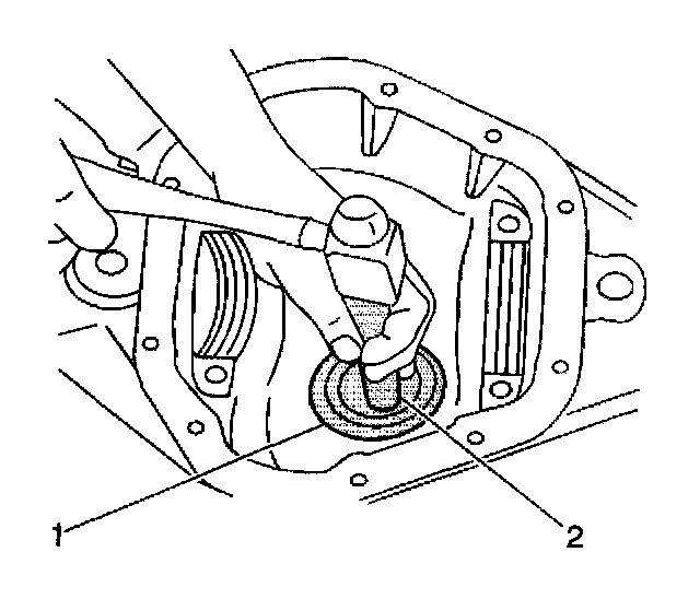 1. Install the outer pinion bearing cup using the J 8611-01, 8.6 inch axle, or the J 7818, 9.5 inch axle (1), and the J 8092 (2).