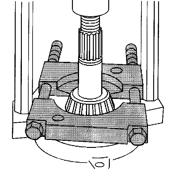 6. For the 9.5 inch and 11.5 inch axles, press the bearing off of the drive pinion using the J 22912-01.
