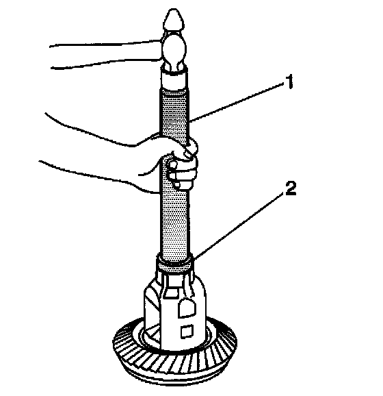 3.3. Install the J 24430 or the J 45900 (2) and the J 8092 (1) over the differential side bearing.