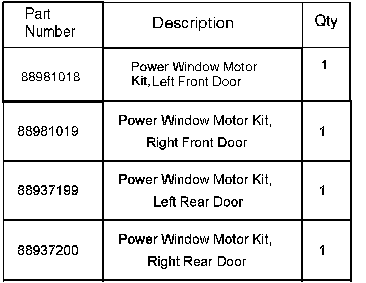 The front window motor part numbers shown are applicable to vehicles from the 1999 to 2004 model years. The rear window motor part numbers shown are applicable to vehicles from the 2000 to 2004 model years.