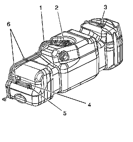 3. Disconnect the fuel feed pipe (4) and return pipe (5) from the fuel tank clips (6).
