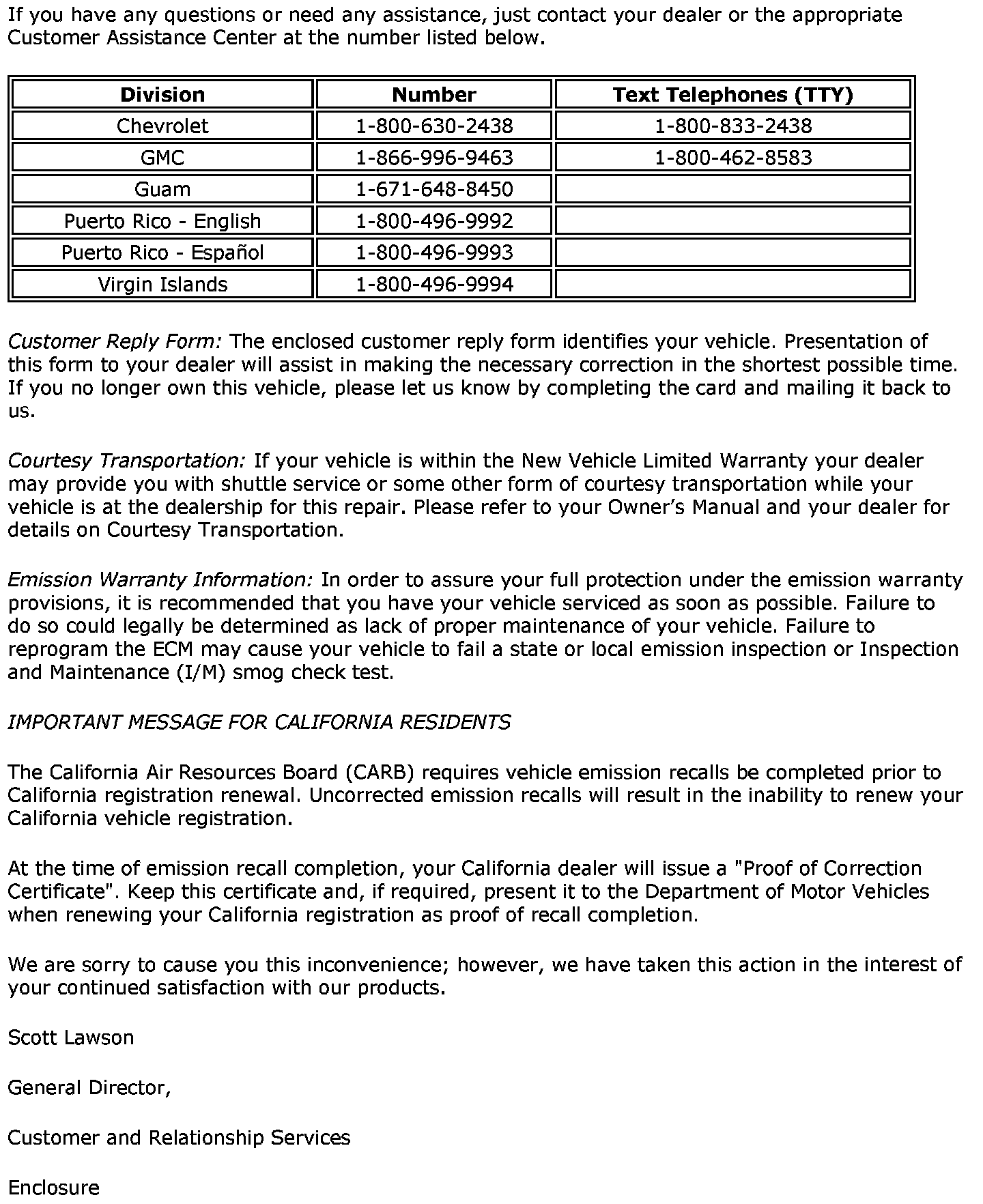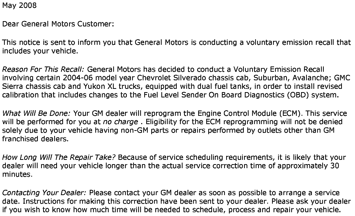 Recall - ECM Update for Fuel Sender OBD Diagnostics