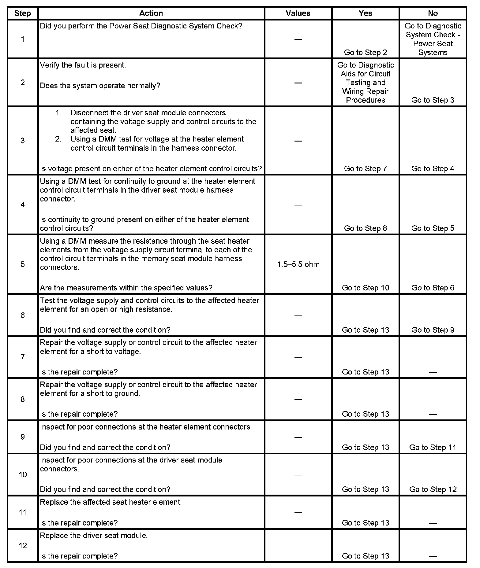The driver seat module determines by monitoring the heater element control circuits that a short to voltage, short to ground, or open condition exists.