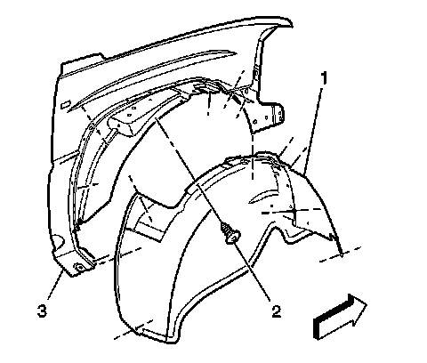 7. Install the push-in retainers (2) in order to attach the wheelhouse panel (1) to the fender (3).