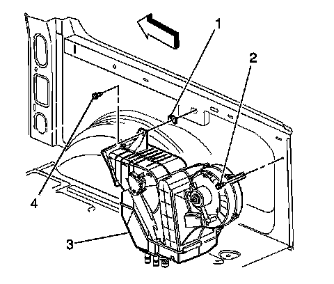 16. Remove the fasteners (2,4) retaining the auxiliary HVAC module to the vehicle.