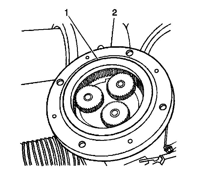 3. Install the bolts (1) retaining the steering gear motor (2) to the steering gear.