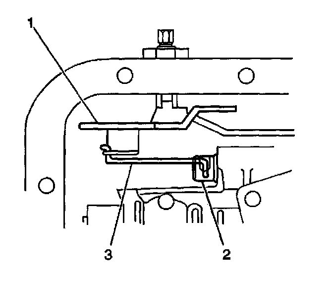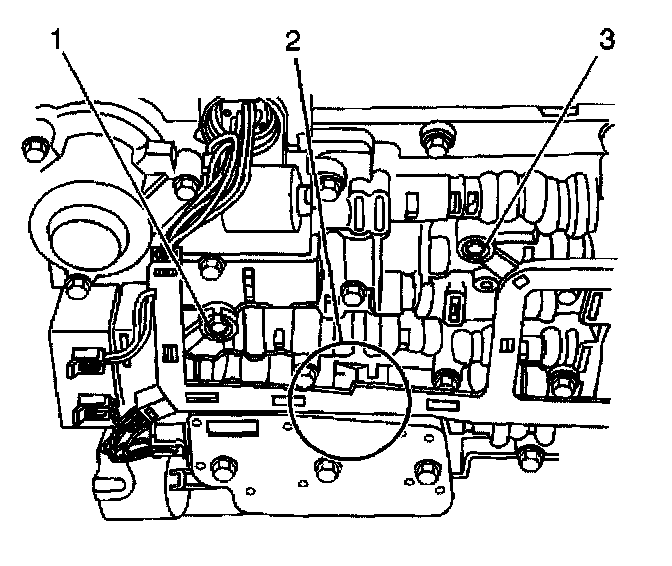 3. Verify that the manual valve link (3) is installed properly to the inside detent lever (1) and the manual valve (2).