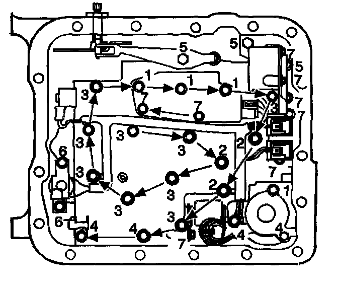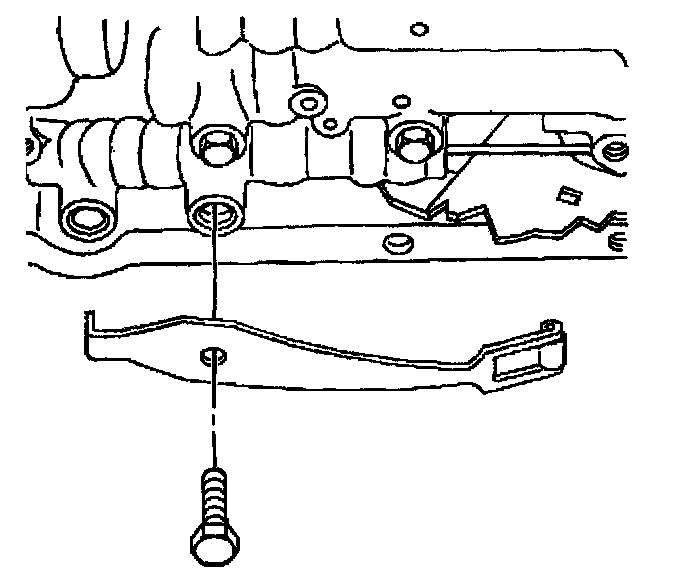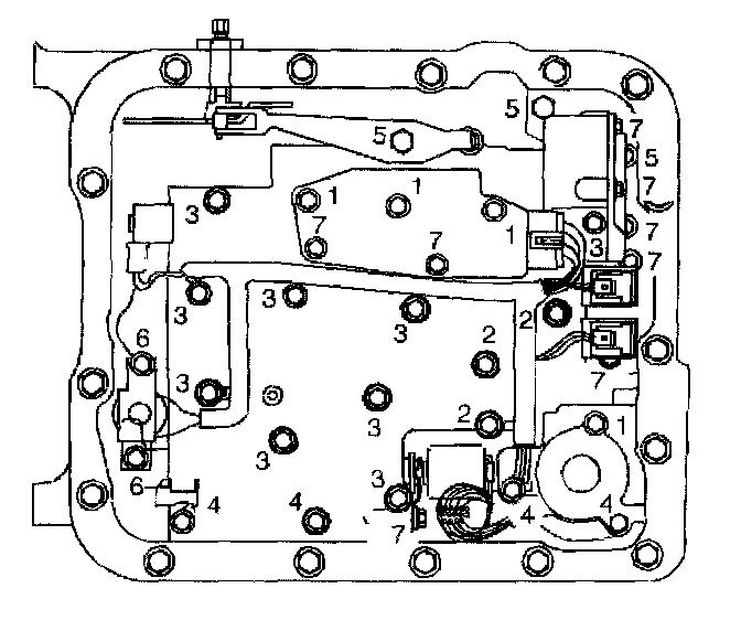 5. Do not install the transmission fluid indicator stop bracket and bolt at this time. Install but do not Tighten the valve body bolts which retain only the valve body directly. Each numbered bolt location corresponds to a specific bolt size and length, as indicated by the following: