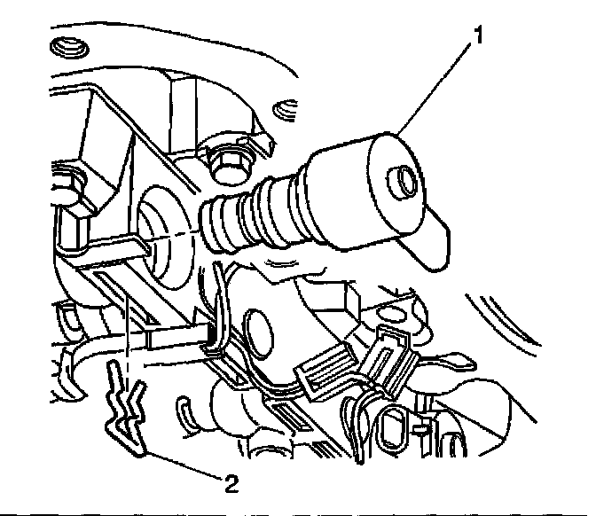 7. Remove the TCC PWM solenoid retainer (2) with a small screwdriver. Rotate the solenoid (1) in the bore, if necessary, until the flat part of the retainer (2) is visible.