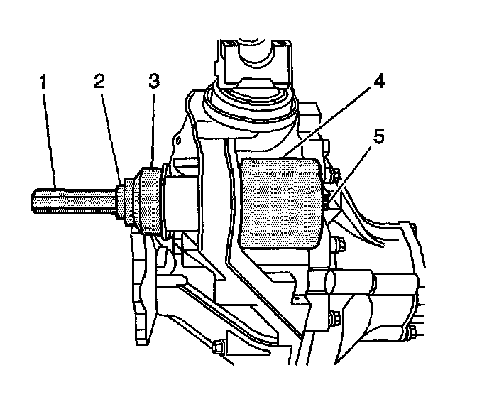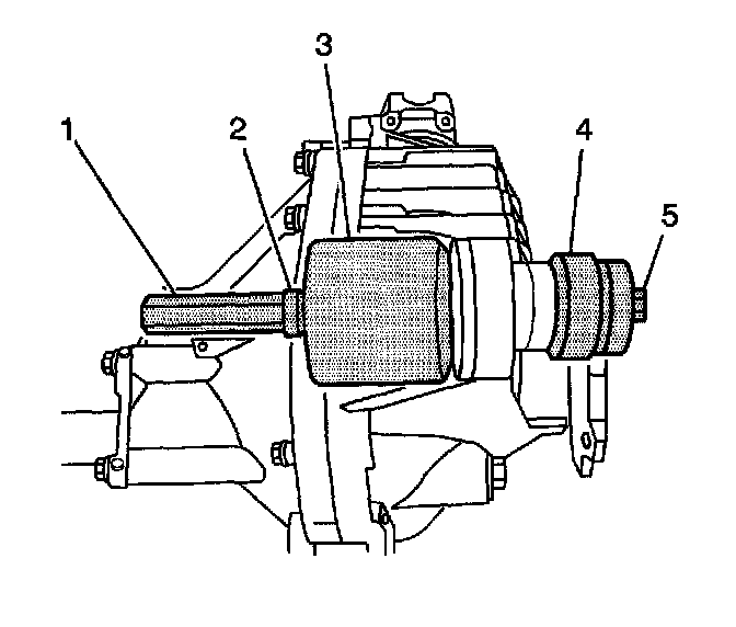 1.1. Install the J 21474-18 (1), the thrust bearing (2), the J 36616-2 (3), the J 36616-1 (4), and the forcing screw (5) as shown.