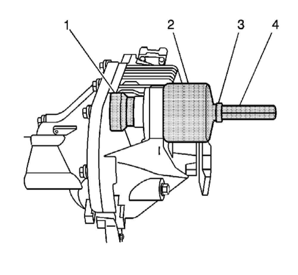 1.1 Install the J 36616-2 (1), the J 33791-1 (2), the thrust bearing (3), the J 21474-18 (4), and the forcing screw as shown.